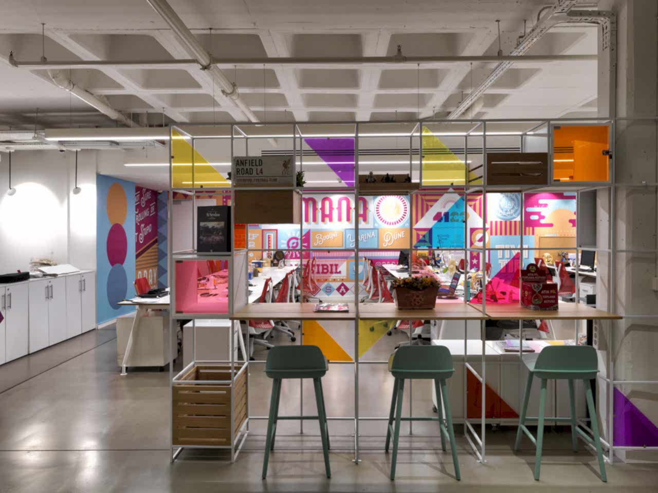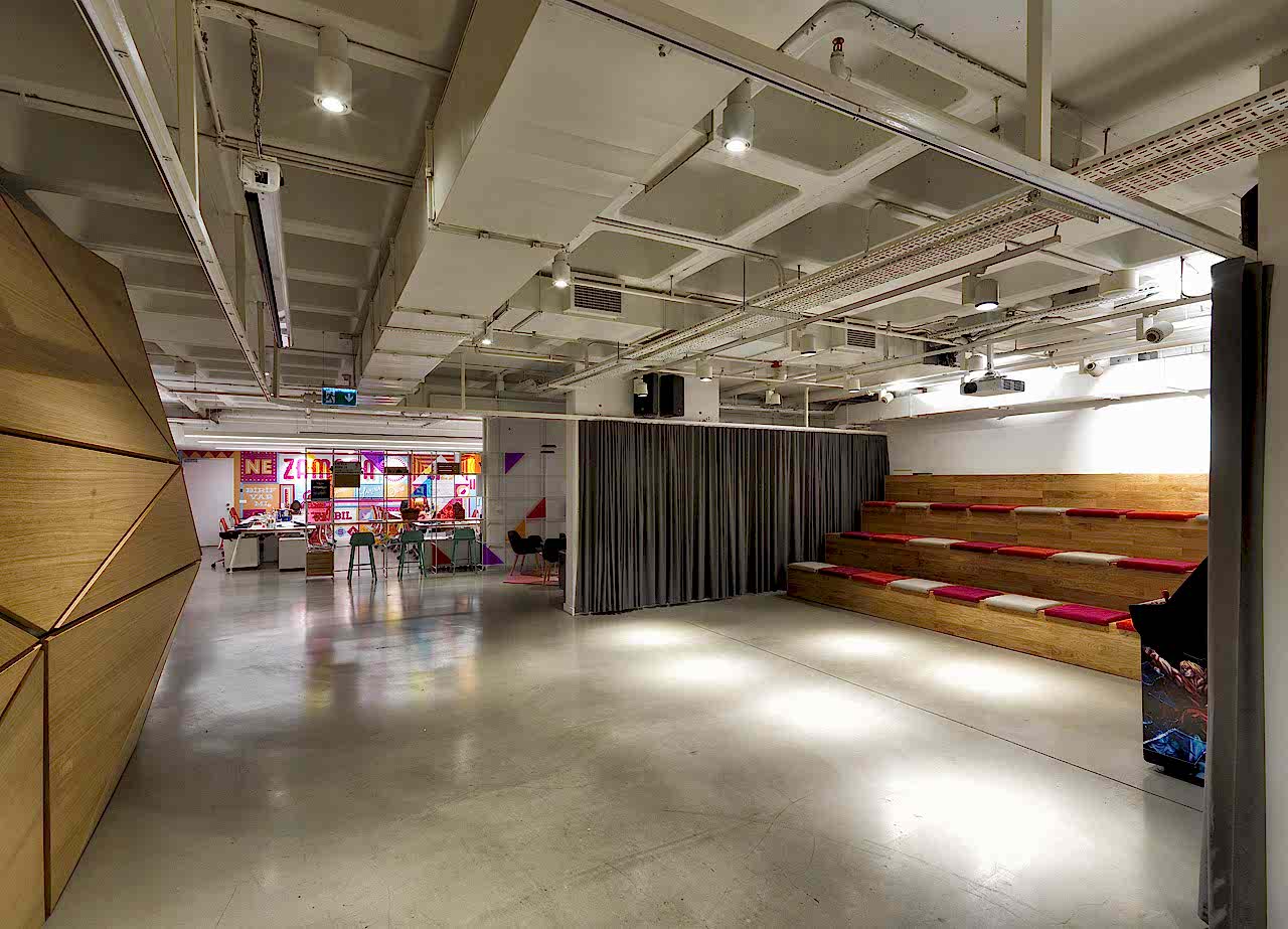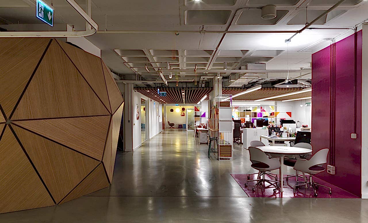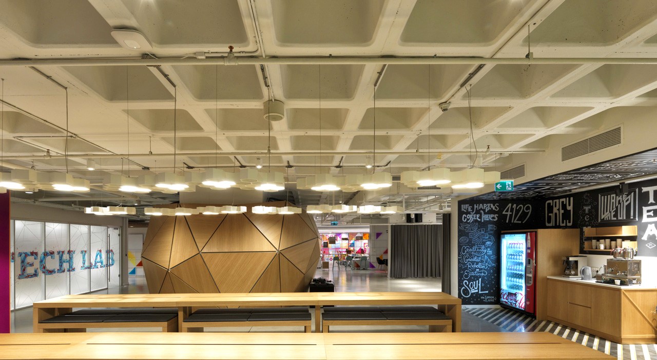 Ofisin merkezinde, farklı disiplinlerden insanları bir araya getirmek amacıyla kafe, konferans alanı ve dijital medyanın sınırlarını zorlamak için kurulan teknoloji laboratuvarından oluşan büyük bir ortak alan tasarlandı. Hepsinin merkezine ise poligon kabuktan oluşan bir ‘pod’ yerleştirildi. Beyin fırtınası için kullanılacak bu mekan, aynı zamanda poligonal şekillerin bir araya gelmesiyle temsil edilen ‘dijital olasılık’ fikrinin merkezini oluşturuyor.