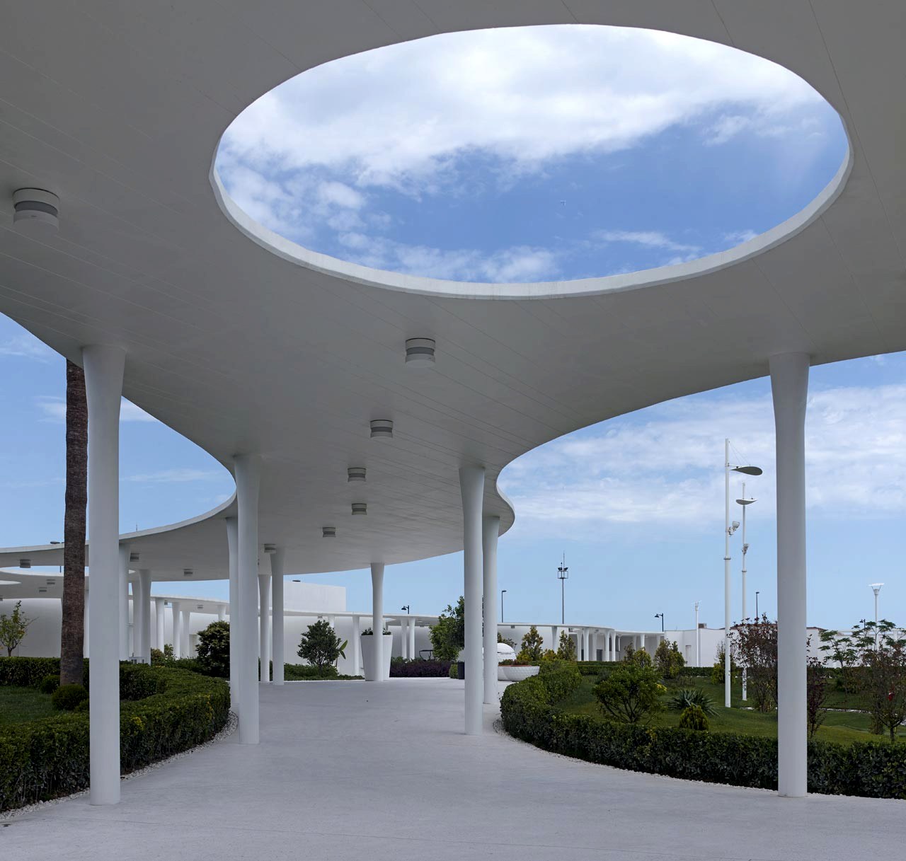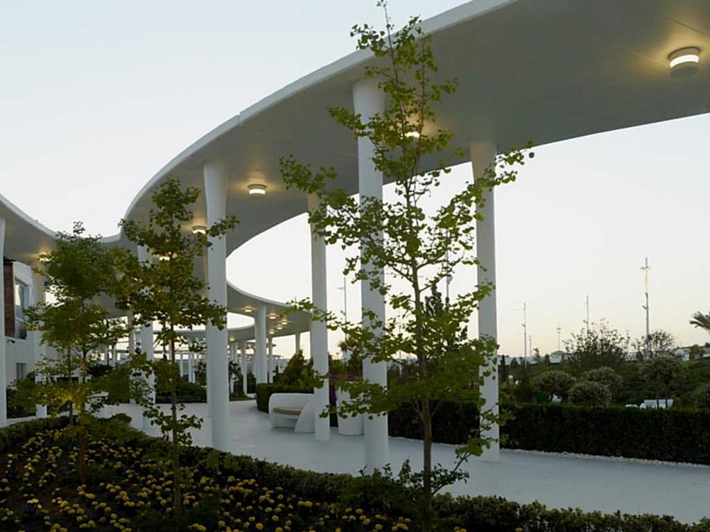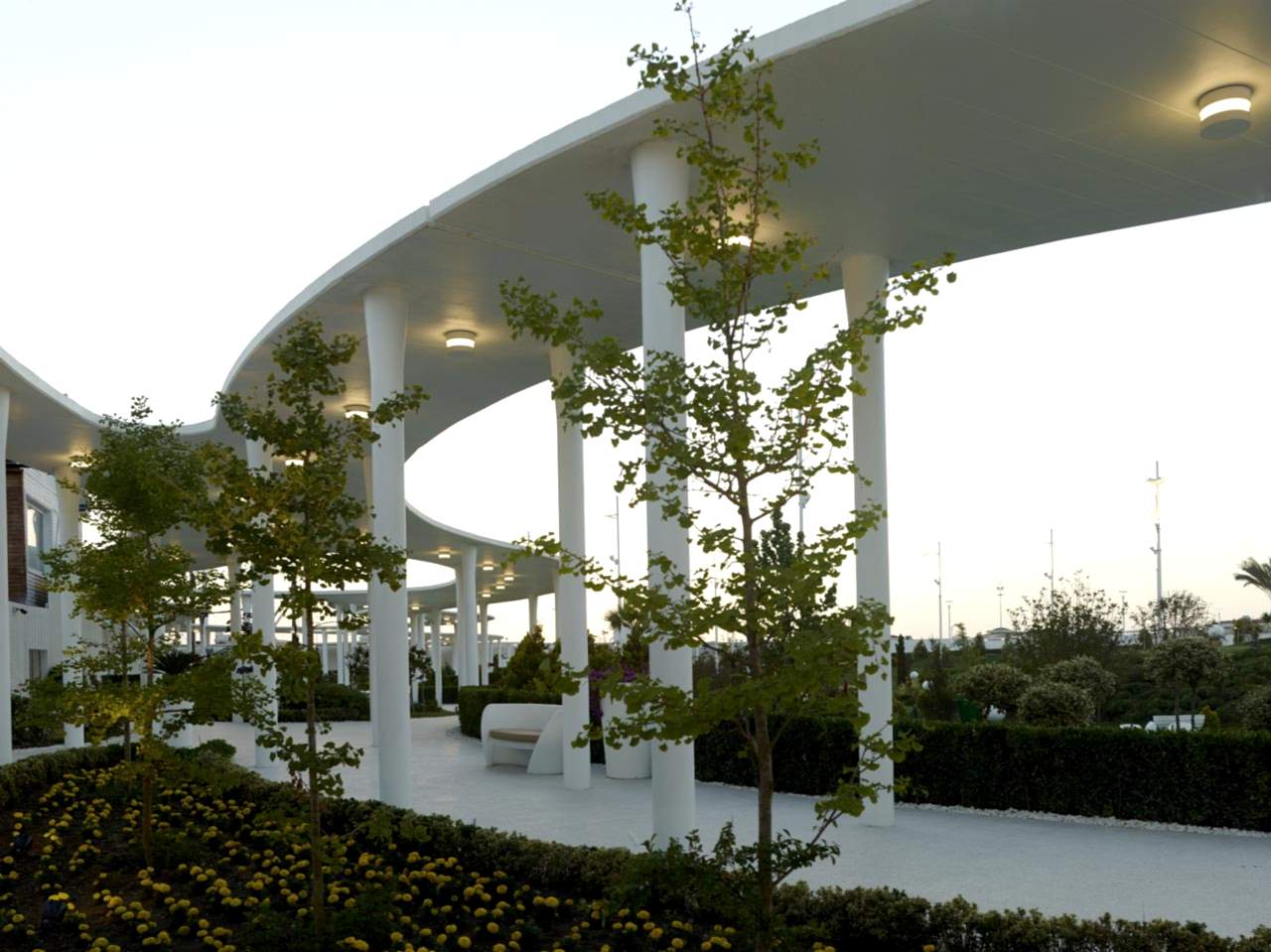 Projenin mimari kimliğini ve mekansal bağlantılarını oluşturan bu yol ve saçaklar, 560 tane kompozit kolon ve onlar üzerinde 9 bin m²lik bir betonarme çatıdan oluşmaktadır. Kompozit bir sistemle üretilen bu kolonların, 14 cm inceliğindeki betonarme saçağı taşıyabilmesi için, bu proje için geliştirilmiş özel bir çözüm kullanılmıştır. Deprem bölgesinde bu şekilde bir saçak oluşturabilmek için, kolon ile saçağın birleşme noktalarında konik açılımlar yapılarak, zımbalama etkilerinin alınması sağlanmıştır. Bu sistem, sadece betonla yapılamayacağı için, kalın sac bir borunun içine beton enjekte edilerek; kompozit bir sistem kullanılmıştır.