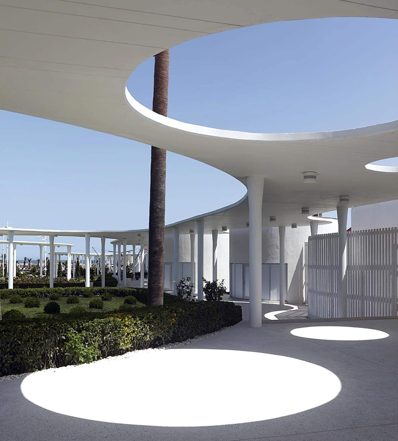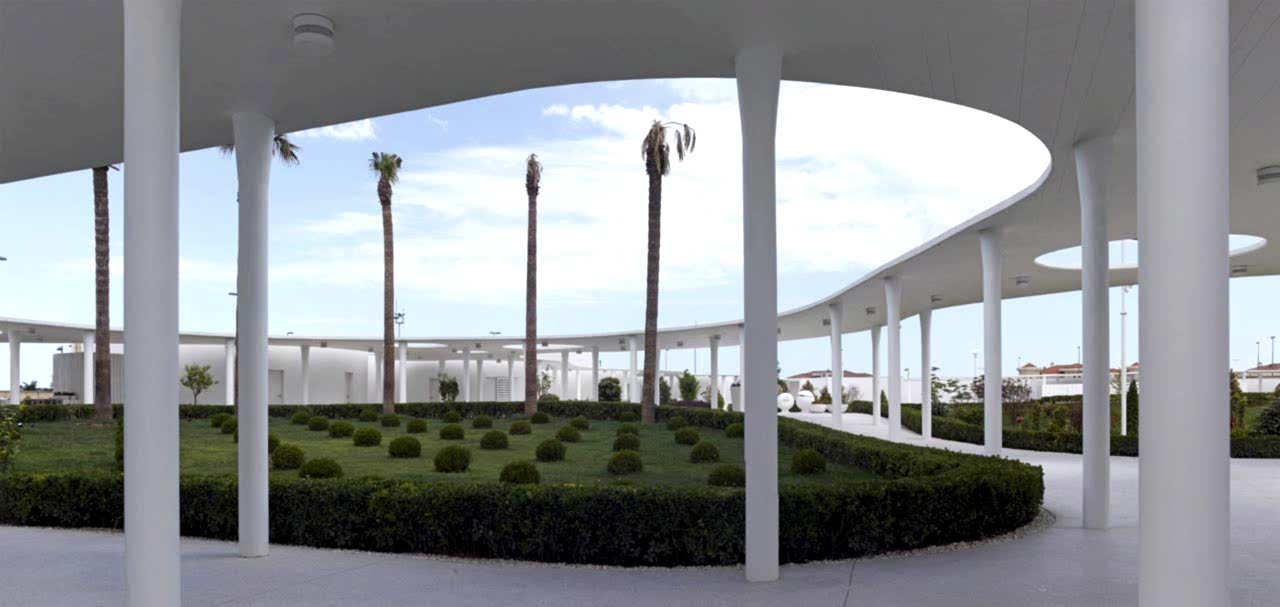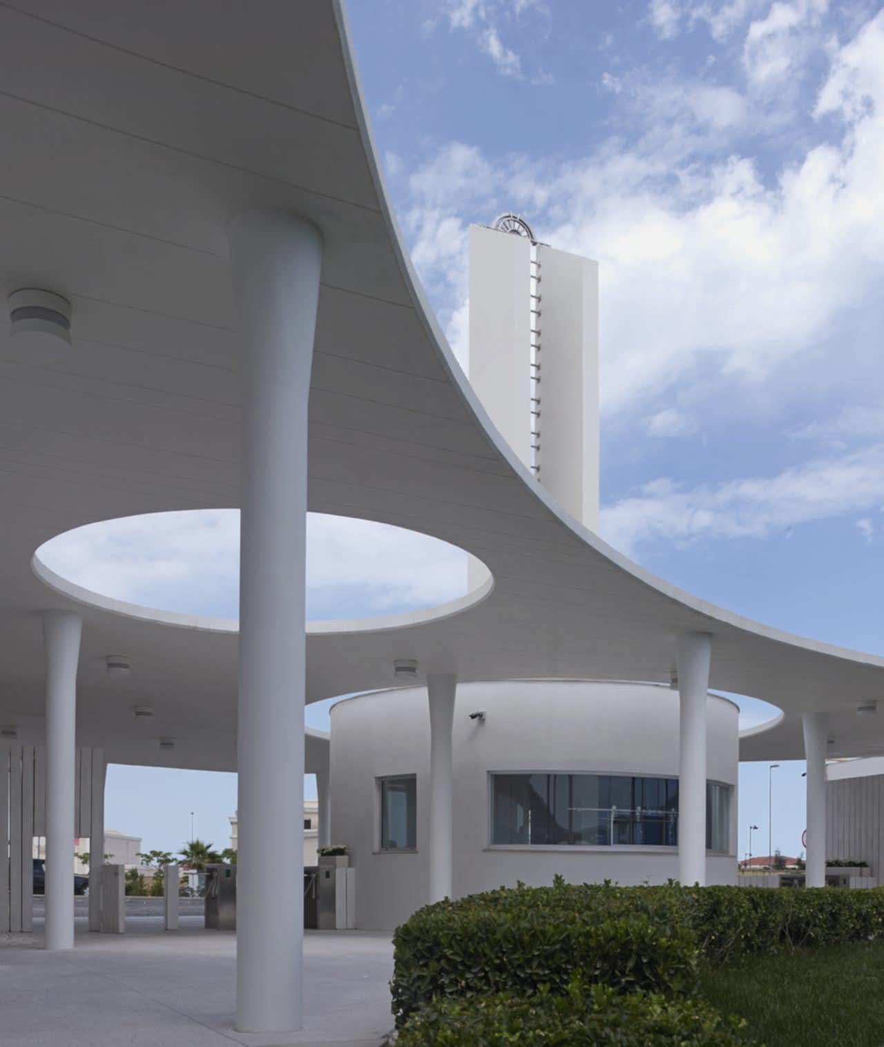 Projenin mimari kimliğini ve mekansal bağlantılarını oluşturan bu yol ve saçaklar, 560 tane kompozit kolon ve onlar üzerinde 9 bin m²lik bir betonarme çatıdan oluşmaktadır. Kompozit bir sistemle üretilen bu kolonların, 14 cm inceliğindeki betonarme saçağı taşıyabilmesi için, bu proje için geliştirilmiş özel bir çözüm kullanılmıştır. Deprem bölgesinde bu şekilde bir saçak oluşturabilmek için, kolon ile saçağın birleşme noktalarında konik açılımlar yapılarak, zımbalama etkilerinin alınması sağlanmıştır. Bu sistem, sadece betonla yapılamayacağı için, kalın sac bir borunun içine beton enjekte edilerek; kompozit bir sistem kullanılmıştır.