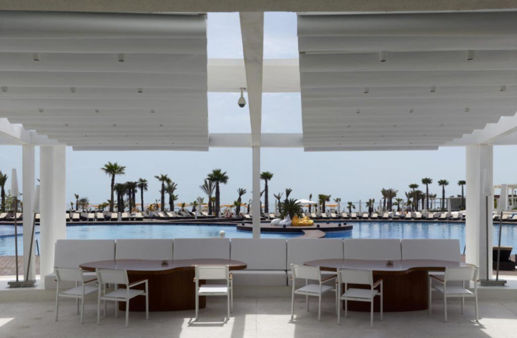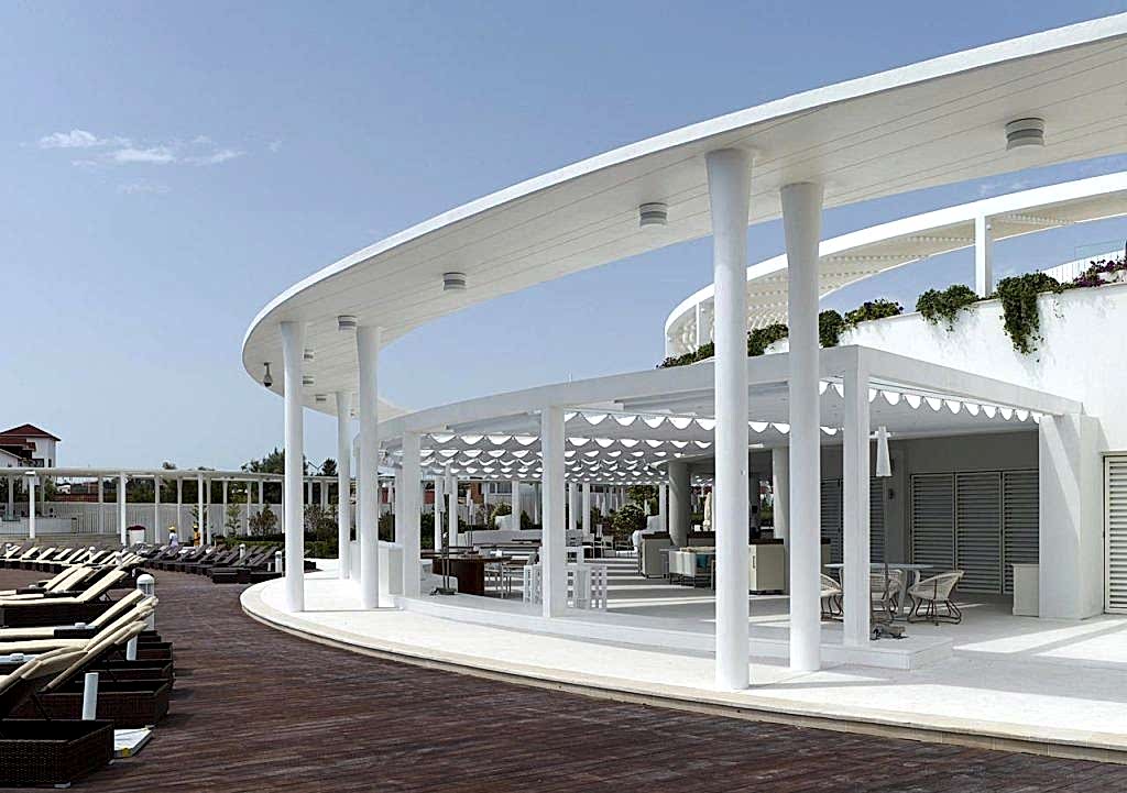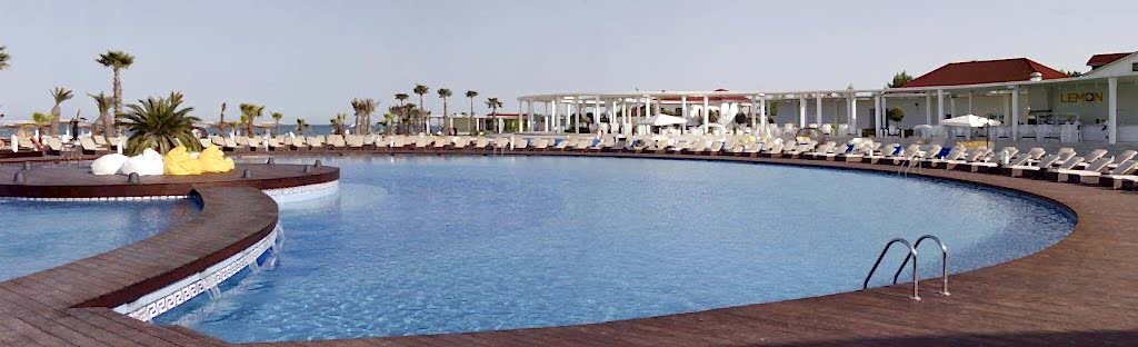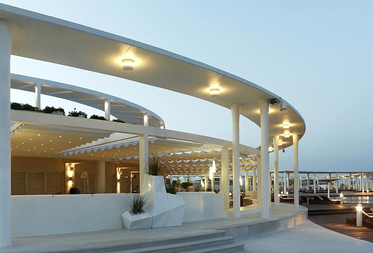 Dar ve uzun dikdörtgen formlu arazideki temel çekim noktası olan, plaj ve havuz çevresinin, daha görünür kılınabilmesi için, çevre güneşlenme terasları, bar ve kafeler, oturma dinlenme bölgeleri arazinin iki uzun yanına paralel biçimde yerleştirilmiş hafifçe yükseltilerek bir vadi etkisi yaratılmak istenmiştir.