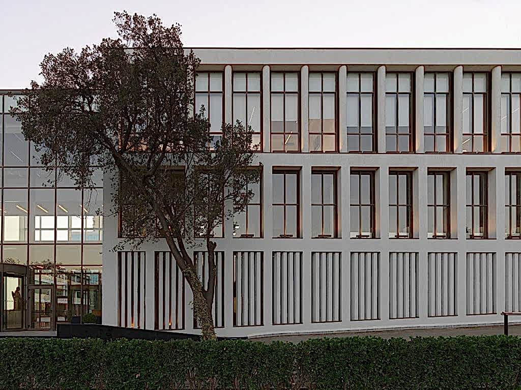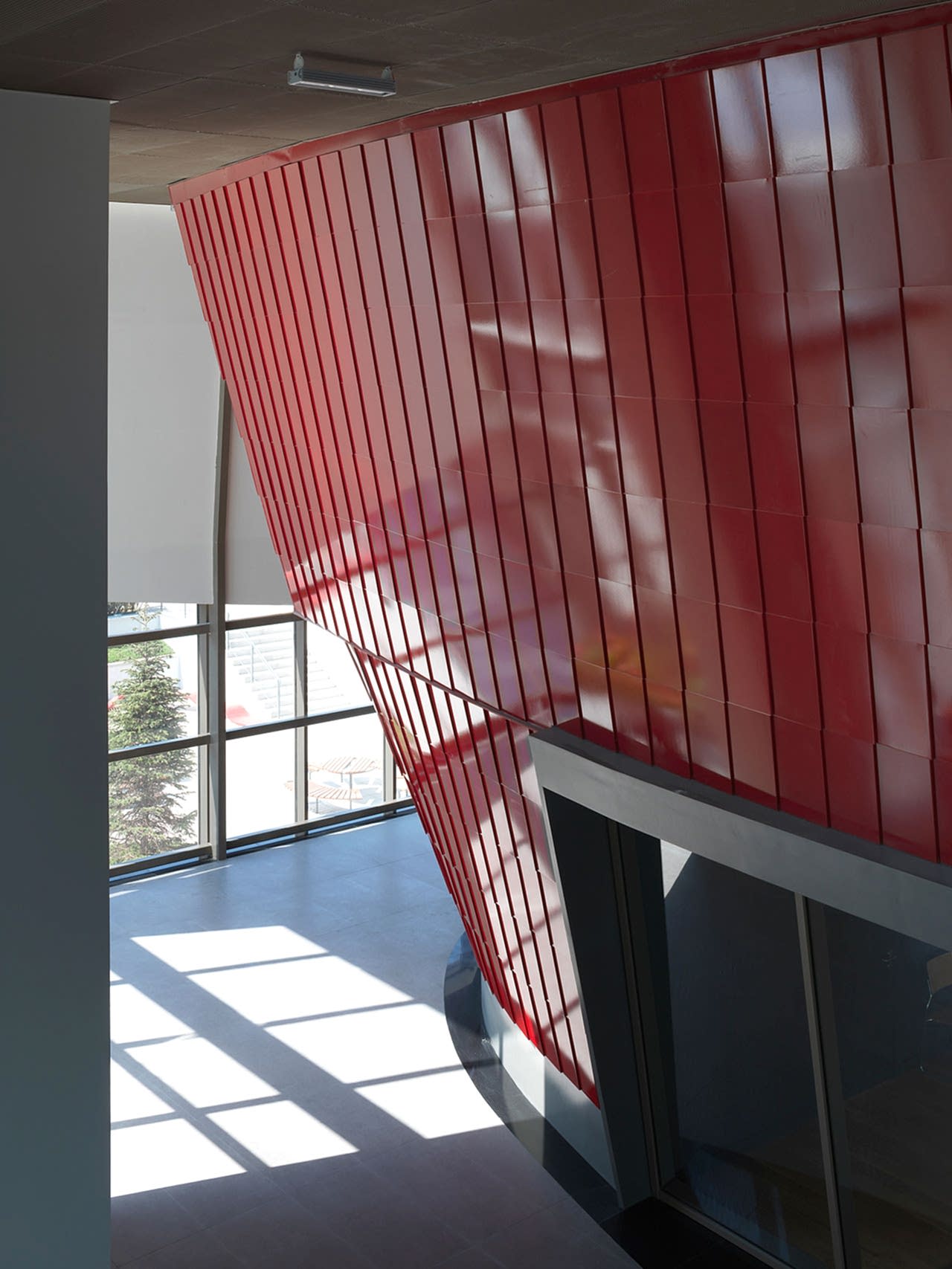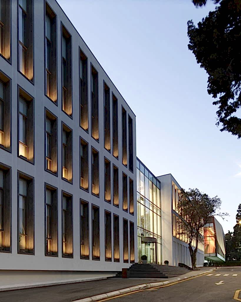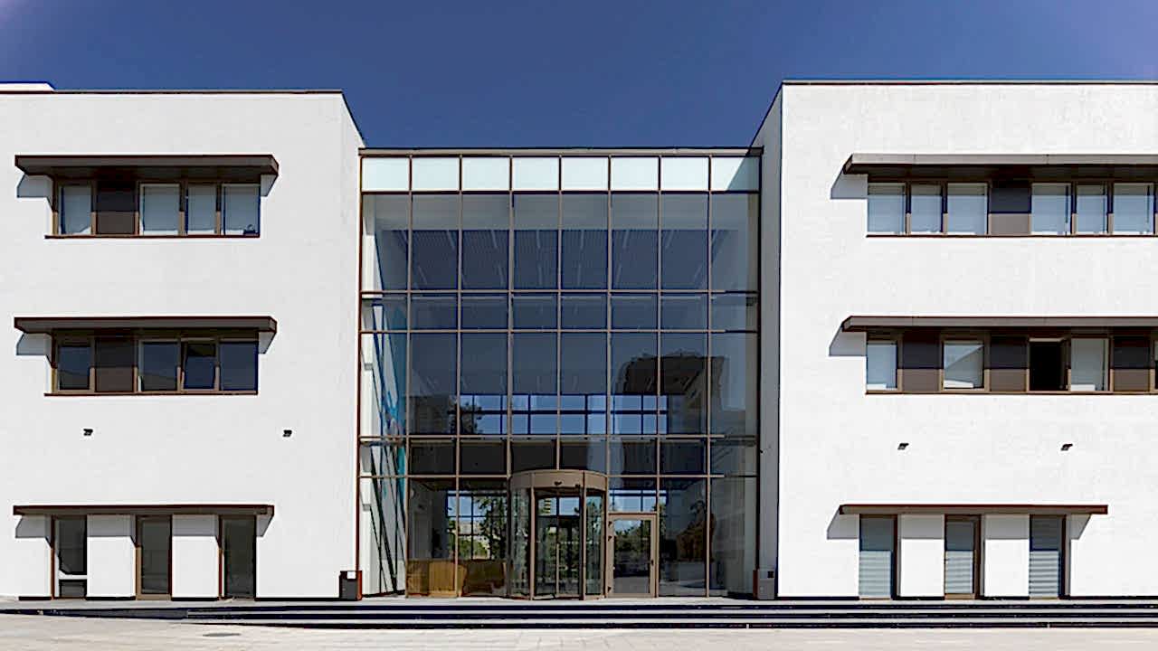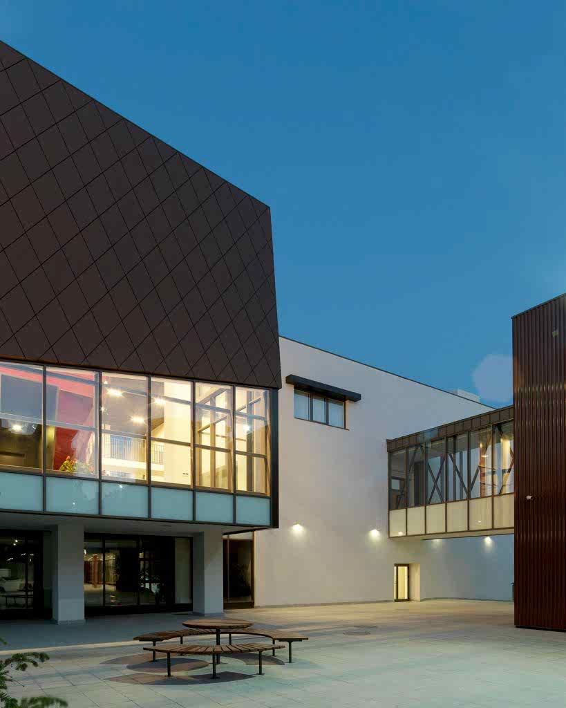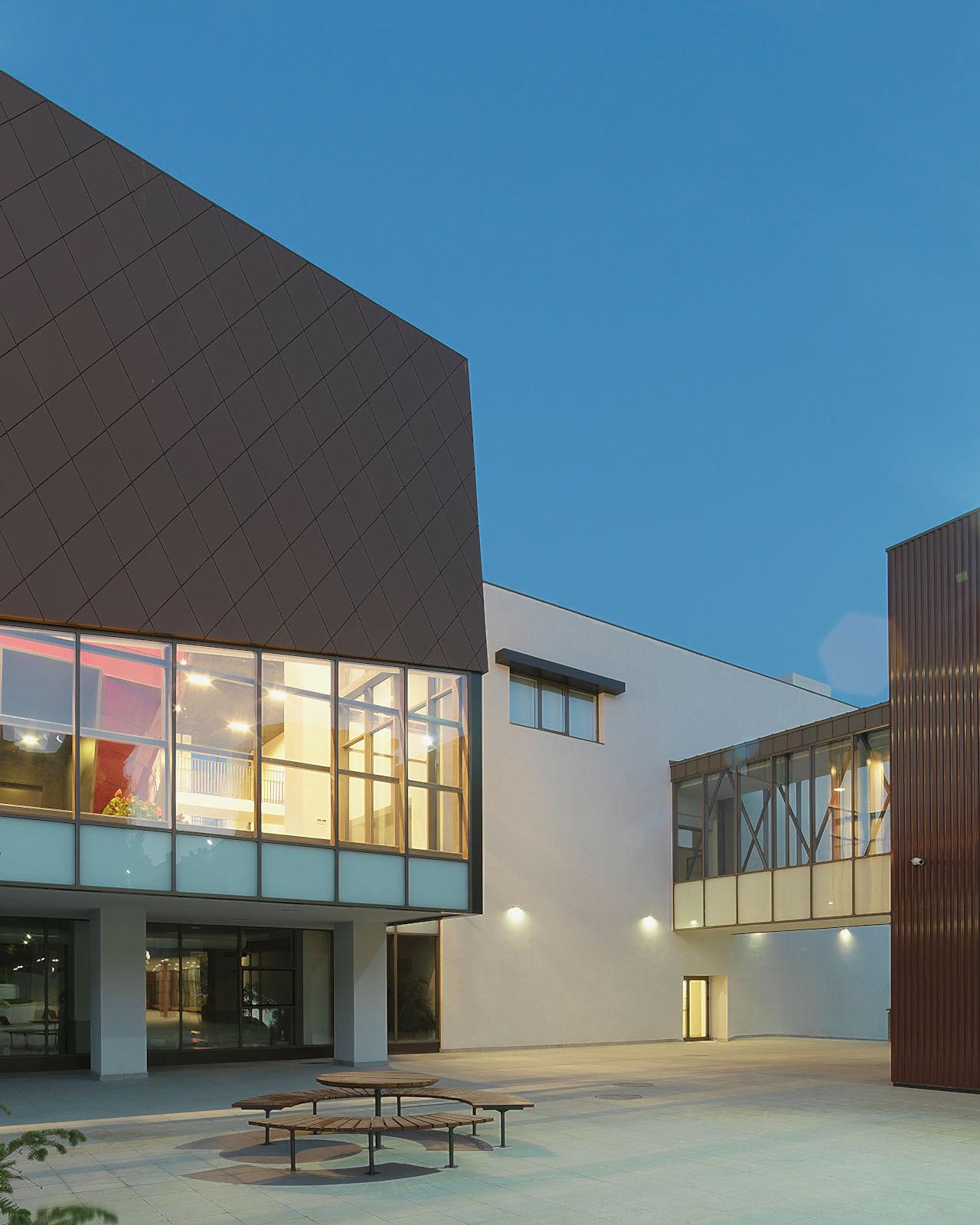 Kampusün kamuya açık işlevini de üstlenen A blok, bulvarın eğimi boyunca parçalanarak eğime oturan farklı fonksiyonların bir araya gelmesi ile oluşmuş çok parçalı bir yapı. Arazinin köşesinde yer alan en alçak noktada konumlanan kapalı spor sahası ve yüzme havuzu tekil bir yapı olarak kentin farklı noktalarından okunabiliyor. Arazide yukarı çıkıldıkça, ofis ve öğretmen odalarının yer aldığı yönetim binasına bağlanıyor. Yönetim binasının ortasında yer alan şeffaf kütle ise park ile olan görsel ilişkiyi kuvvetlendirirken, bir yandan protokol girişi işlevi görüyor. Alanın en üst kotuna yerleşen yarı saydam tekil yapıda ise yemekhane ve 400 kişilik konferans salonu bulunuyor.