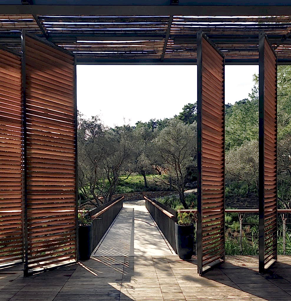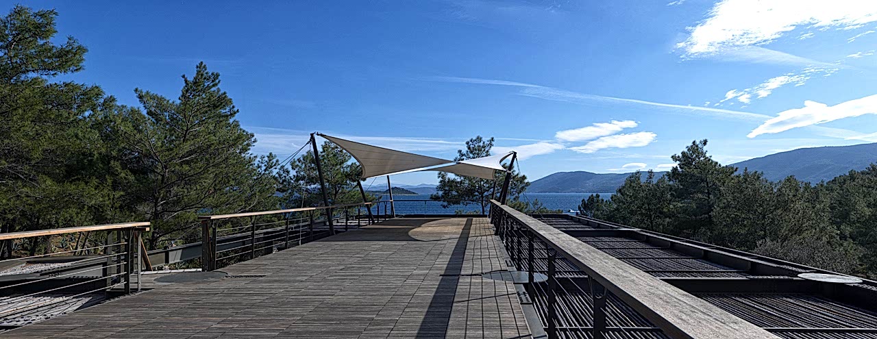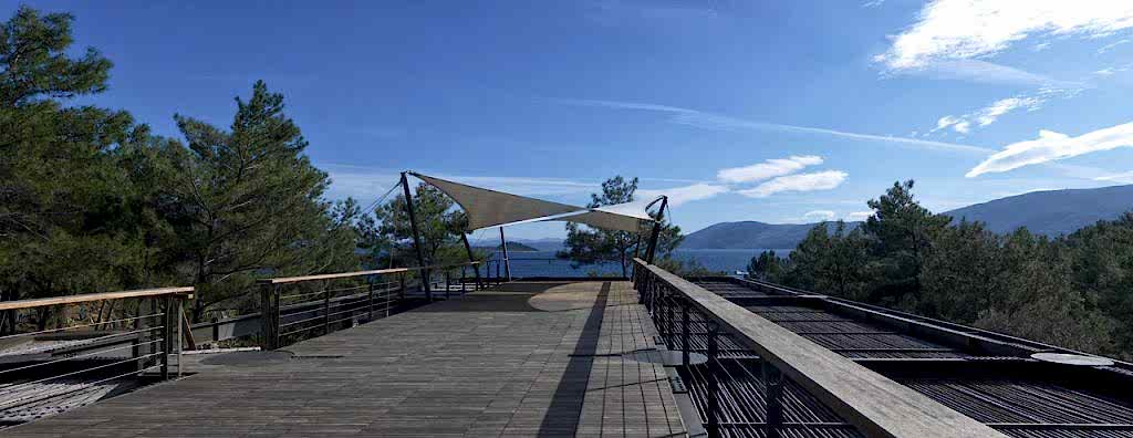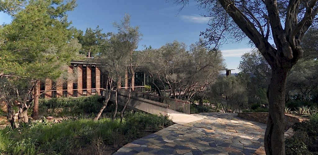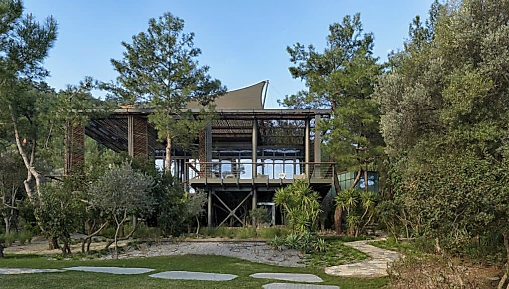 Yapı, mevcut dere yatağının yakınında konumlandırılarak, sıcak iklimin etkilerinin azaltılması amaçlanmıştır. Ziyaretçilerin erişimi için girişte küçük bir otopark alanı organize edilmiş, denizden ulaşım içinse tekne yanaşma iskelesi tasarlanmıştır. Yaya erişimi, mevcut ağaçların arasından geçen bir patika ve su akıntısının üzerinden geçen hafif bir köprüyle sağlanmıştır. Bu ulaşım rotası ziyaretçileri doğrudan doğanın içerisine çeker.