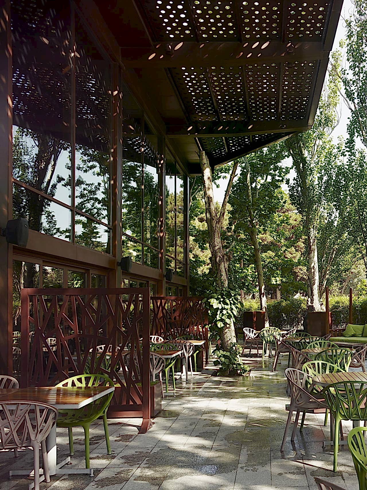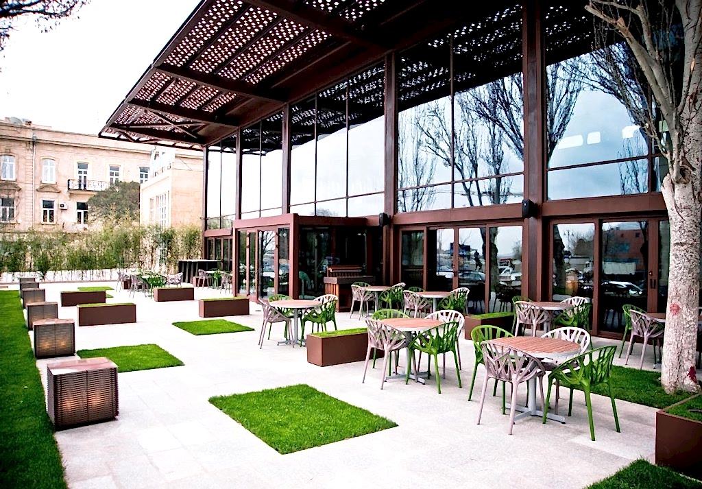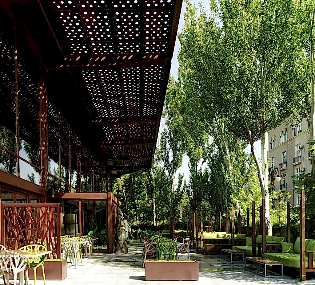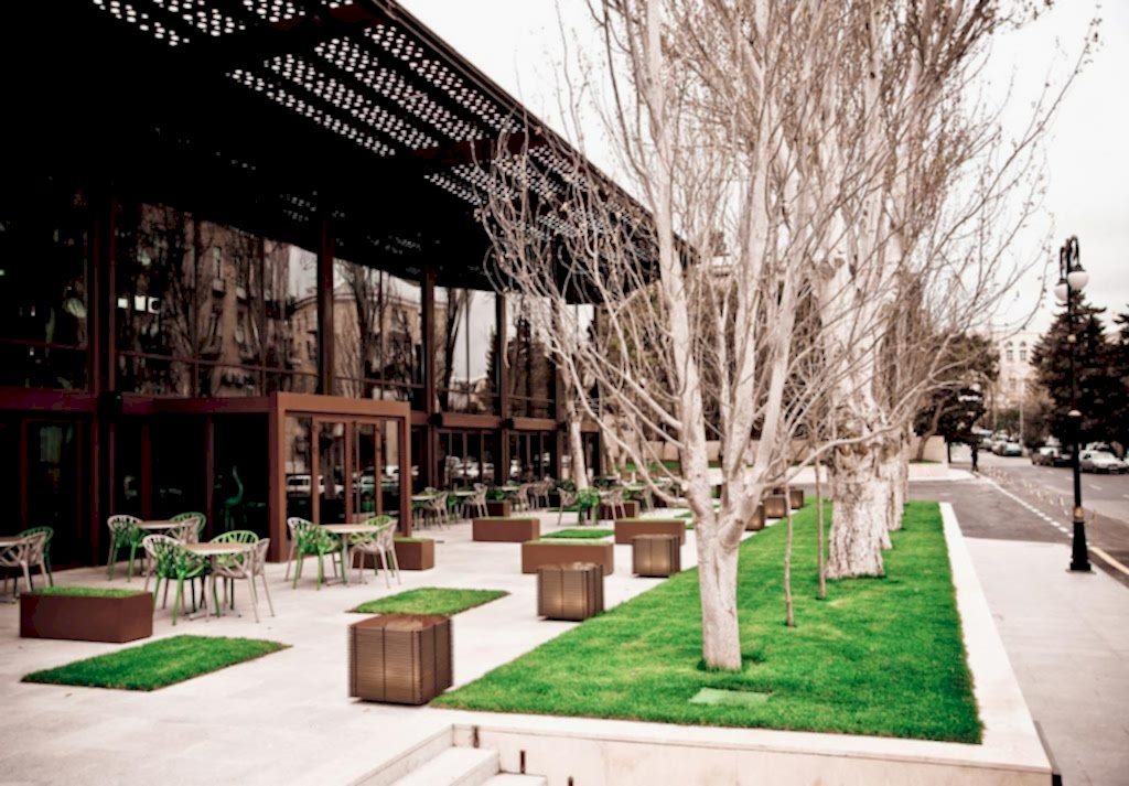 Azerbaycan’ın başkenti Bakü’nün önemli kentsel noktalarından birinde inşa edilen, saydam bir restoran tasarımıdır. Yapı, kent duvarı gibi algılanması arzulanan sert bir kabuğa takılmış çelik çatı ve buna asılı asma kattan oluşur. Boşluklu, ışık geçiren saçak geniş dış mekanları gölgede bırakır, tamamen saydam cephe ise iç mekanı kent mekanına taşır.