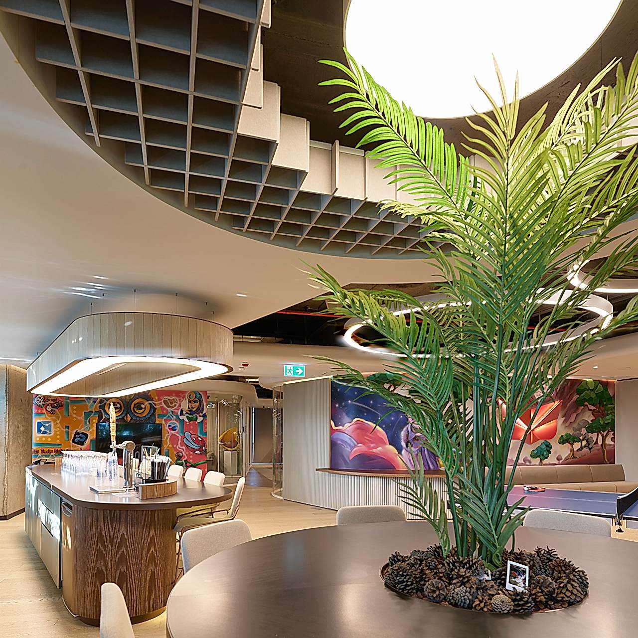 Mevcut ofislerinde tavana monte edilen canlı bitkiler, kullanıcıya keyifli ve yaşayan bir ofis hissiyatını vermiştir. Bu hissi devam ettirmek için yeni ofiste yeşil kullanımının arttırılması hedeflendi. Yeni ofisin 9. Katta olması sebebi ile çevre binaların çatı ve mekanik teras ekipmanları ofis içinde bazı noktalardan görülmektedir. Yeşil kullanım şekli değiştirilerek; dikey ve bir paravan şeklinde kullanılarak görsel olarak rahatsız eden görüntüleri sosyal alanlardan gözlenmesi engellendi.