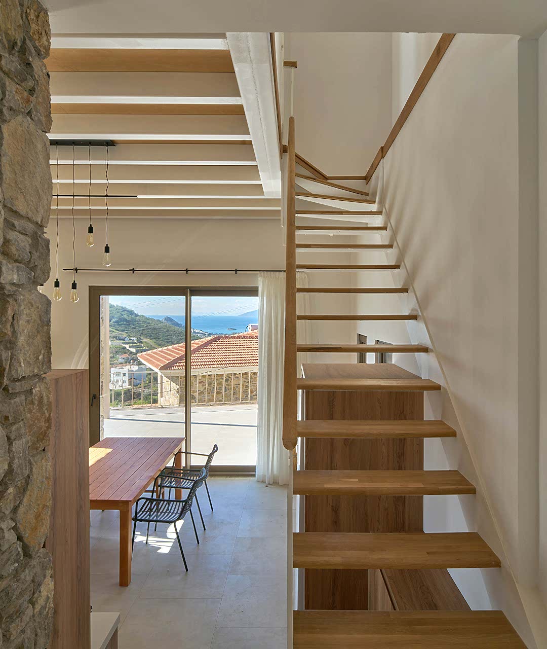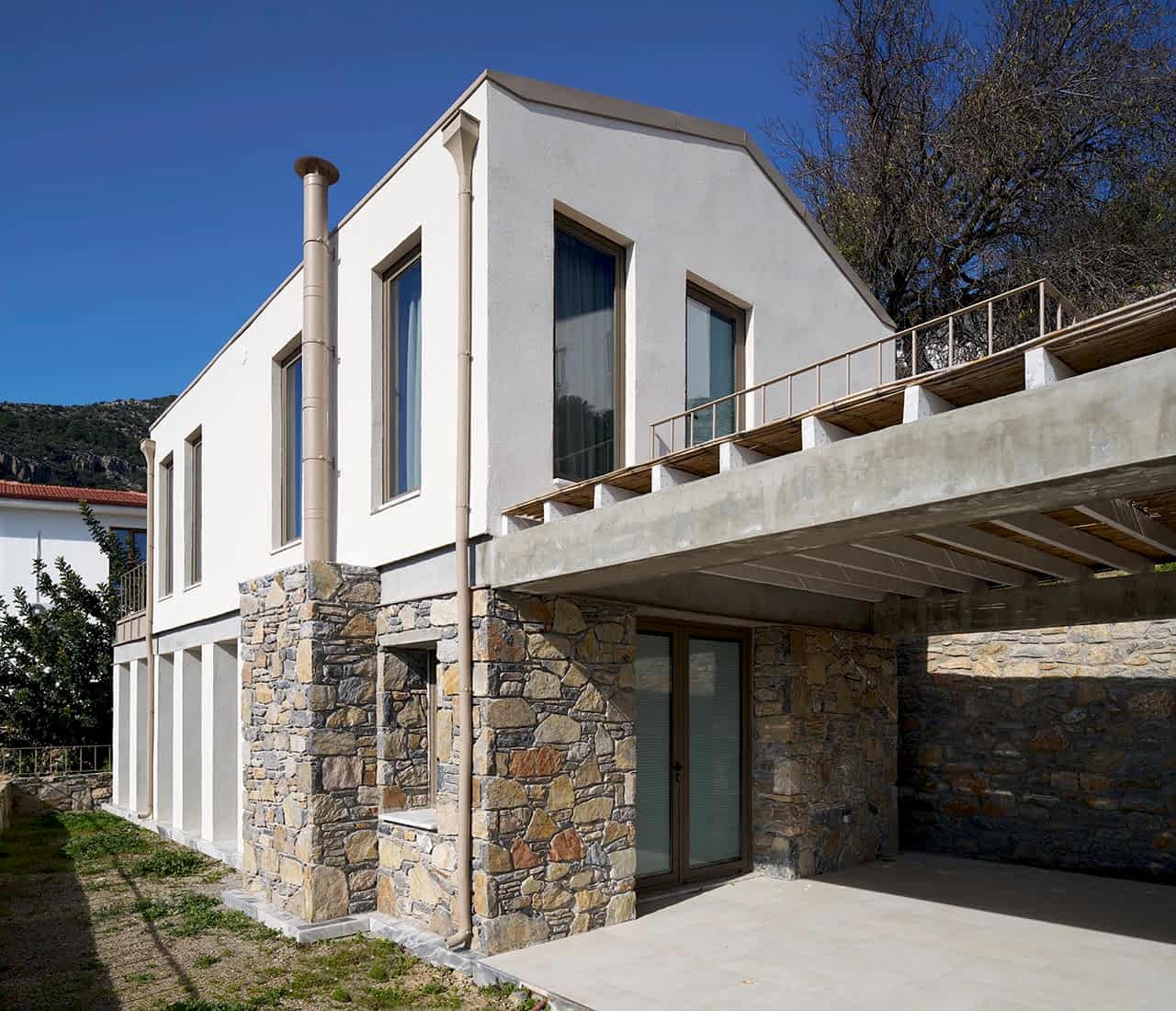 Zemin katlarda taş betonarme karma sistem, villaların ağır bazasını oluştururken, üstteki modern ek hafif kütleyle yatak odalarına ev sahipliği yapar. Köy içinde, betonyer giremeyecek dar yollar ve araç trafiğine uygun olmayan eğimin olması sebebiyle, maliyet ve işçiliği kolaylaştırmak için, hafif, elle taşınabilir kutu profil malzemeler özellikle tercih edilmiştir. 60x100x4 kutu profillerle oluşturulan birinci kat duvarları ve 60x120x4 kutu profillerle oluşturulan çatısının karkası bu malzemelerle çelik konstrüksiyon olarak oluşturulmuştur. Daha sonra çatı kiremit altı ve döşeme kontrplakla kaplanmıştır. Çatıya yerleştirilen çatı pencereleriyle, doğal ışığın penetrasyonu ve hava sirkülasyonu sağlanmıştır. Cephe, içeride alçı plakalar, dışarıda ise “aquapanel”, manto ve sıvayla kaplanarak oluşturulmuştur. Yeni yapılan bu çağdaş eklerin, dönemini anlatan ve Akdeniz kimliğine uygun basit sade ekler olmasına çabalanmıştır. Ana kütlelere ek olarak, izin verilen ölçü ve mesafede müştemilatlar oluşturulmuştur. Bu eklerin taş duvar üzerinde yer alan hatıl- kirişle aynı kotta çerçevelenmesi planlanmıştır. İki kütle arasında ise ahşap merteklerle “hayat” denilen kısım oluşturulmuştur. Bu pergolaların bir kısmının üzerine, yine ahşap bir döşeme ile küçük balkonlar yerleştirilmiştir. Eski taş duvar, eski taşlarla yapılmış yeni taş duvar, çelik konstrüksiyon üzeri beyaz sıvalı duvarlar ve çatıda yer alacak kiremitle, yani üç ayrı malzemeyle proje tamamlanmıştır. Yeniden yapılanmanın olduğu bölgede, köyün yerel kimliğini yansıtan bu evler, yeni ev yapacak olan arazi sahiplerinin ilgisini çekmiş, aynı mimari kimliği kendi projelerine yansıtan projeler üretmeyi amaçlamışlardır.