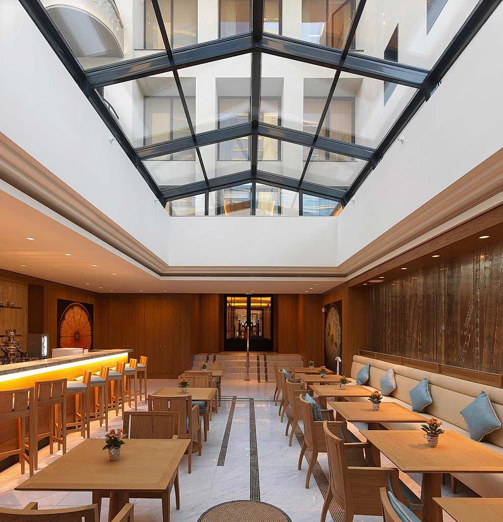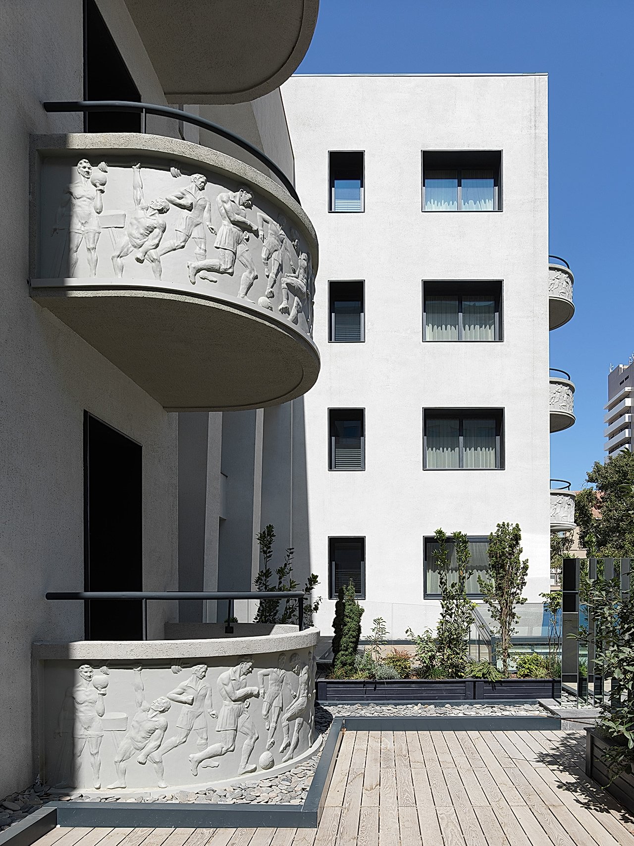Yapının bahçesinde, hem binanın teknik ihtiyaçlarına cevap verecek hem de komşu duvarı, mekanik ekipmanları vb. elemanlar sebebi ile oluşan olumsuz etkinin ortadan kaldırılması amacı ile; tek katlı modern bir ek bina ve kademeli bir yeşil-su duvarı tasarlanmıştır. Bu yapılar aynı zamanda bir iç bahçe mekanı/atmosferi oluşturarak bu mekanın bir açık restoran alanı olarak değerlendirilebilmesini sağlamıştır.Binanın zemin katında restoran ve GYM gibi ortak alanlar; diğer katlarında da farklı kullanım amaçlarına hizmet edebilecek çeşitlilikte bir çok farklı tipte konsept odalar bulunmaktadır.