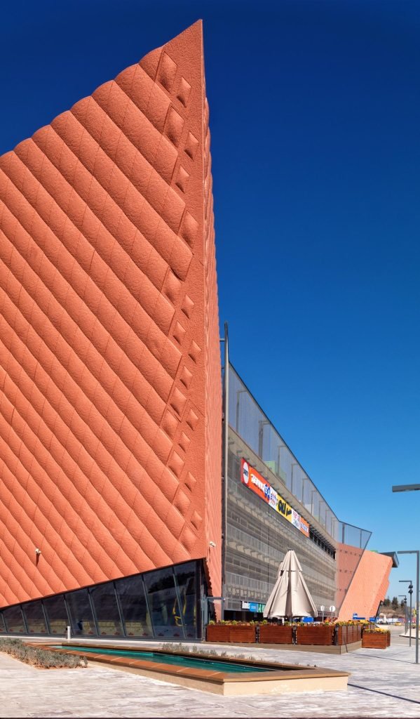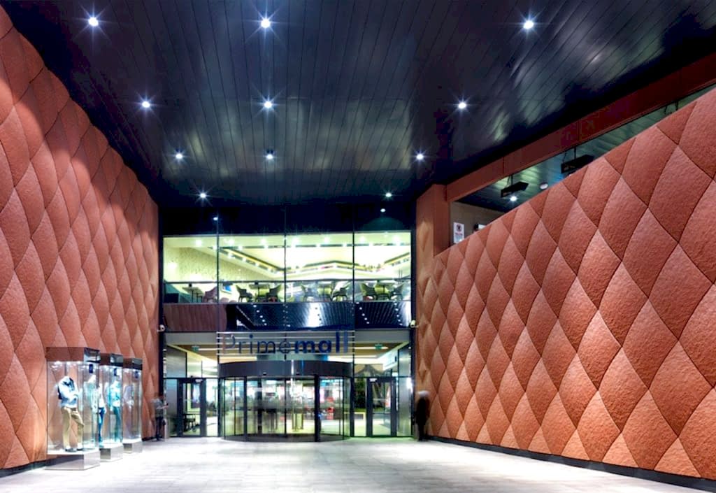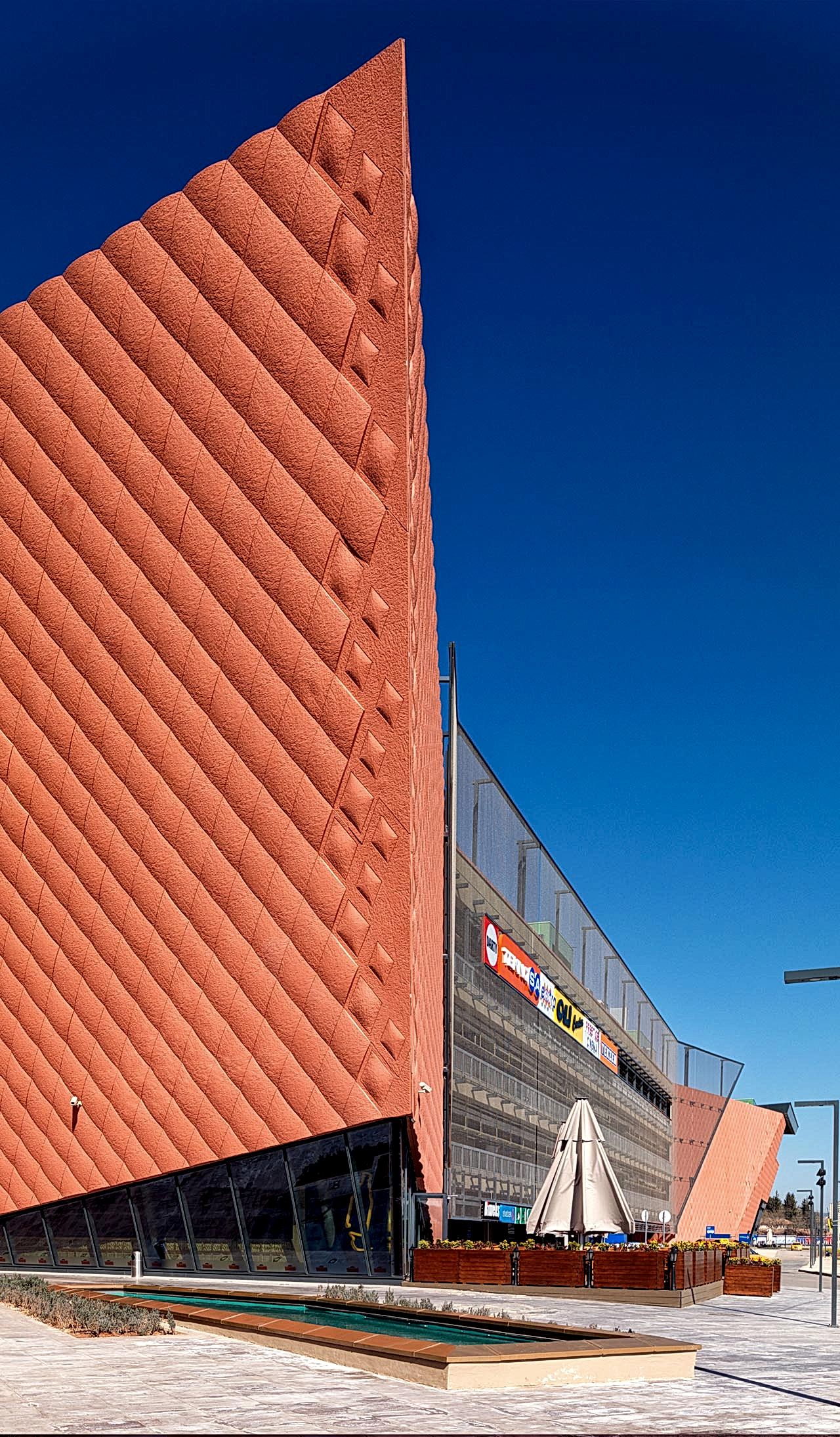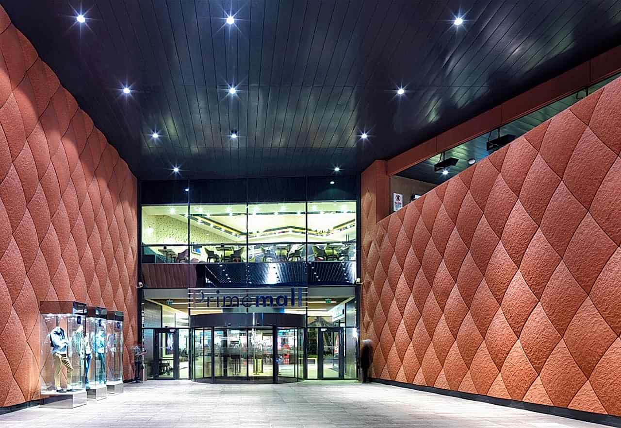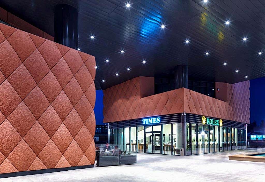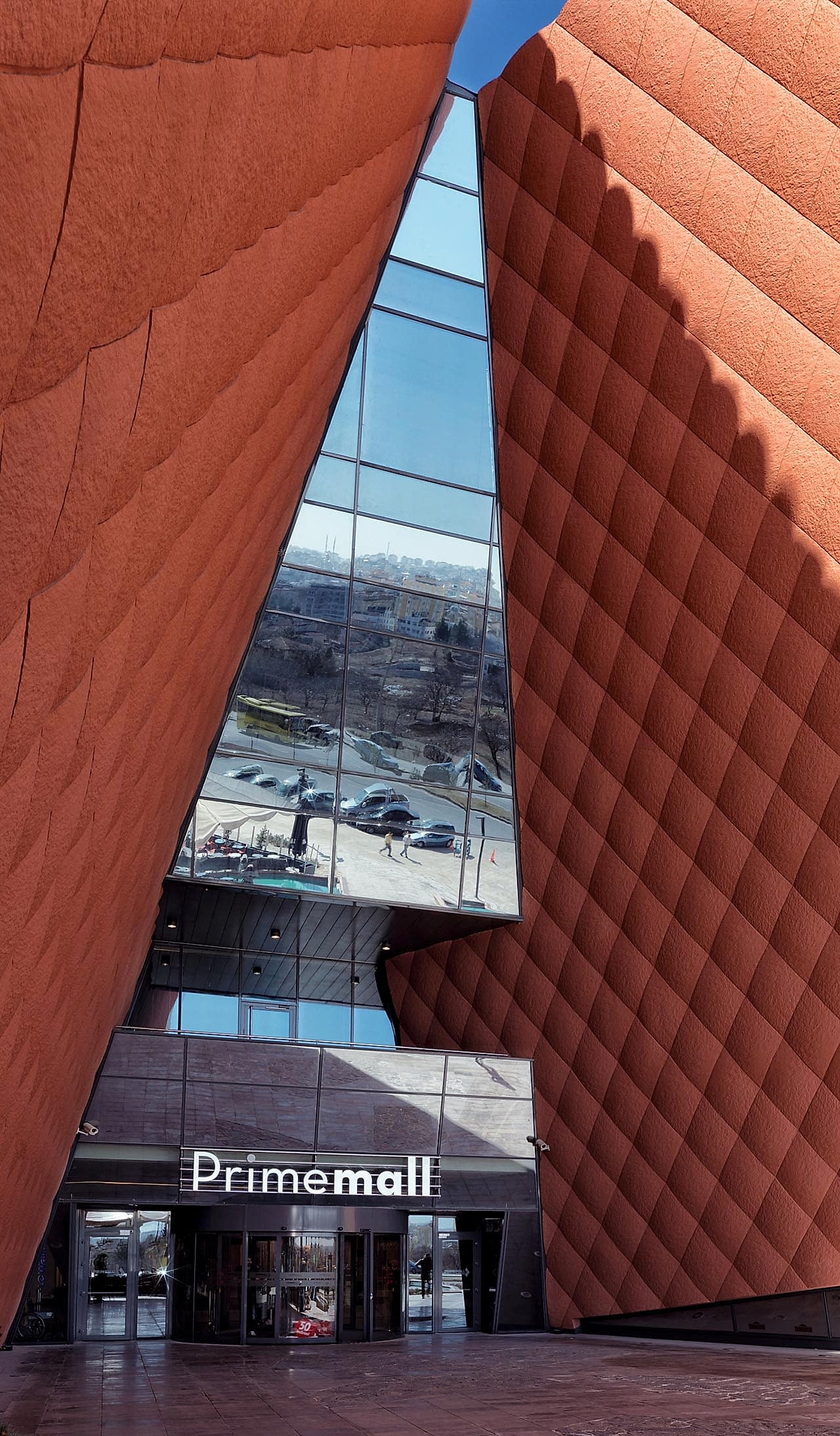 AVM içerisinde, canlılığı maksimum seviyede yakalamak için binanın farklı noktalarından ve kotlarından içeri giriş sağlamak tasarımın öncelikli konularından biri olmuştur. Ön taraftaki Necmettin Erbakan Bulvarı üzerinde yer alan iki giriş, binanın ölçeğiyle orantılı şekilde, anıtsal büyüklükte ve son derece “davetkâr” olması için tasarlanmıştır. Özellikle kuzeyde, binanın köşesine gelen taraf, kademeli olarak ufaltılarak insan ölçeğine indirilmiştir. Uzaktan büyük bir giriş olarak gözükse de, yapının büyüklüğünden kaynaklanan ezici hissiyatı yok etmek için, binayı kademelendirmek; küçük sokaklar oluşturmak, AVM öncesi bir dış arkat yaratarak; şehir ölçeğinden insan ölçeğine inmesi hedeflenmiştir.