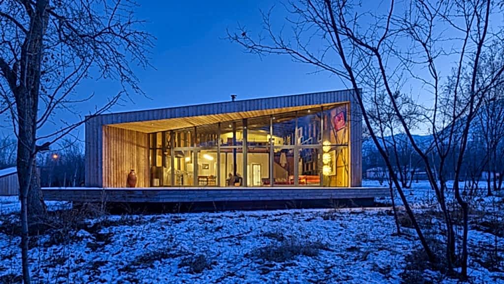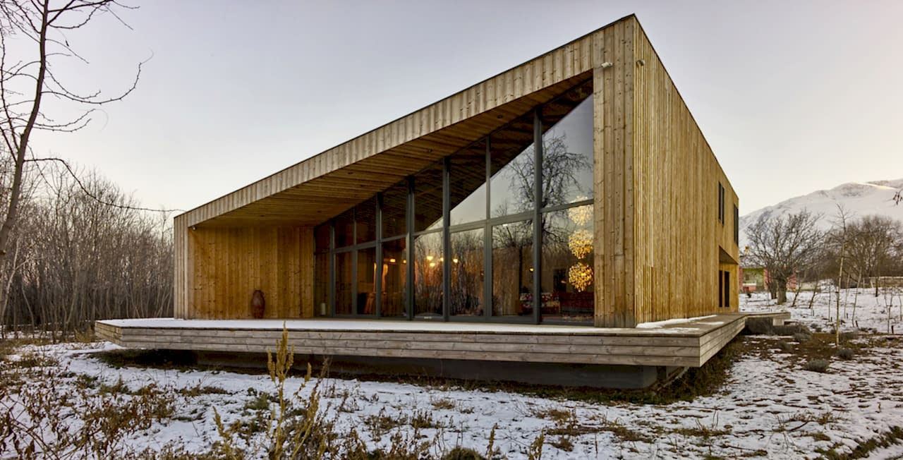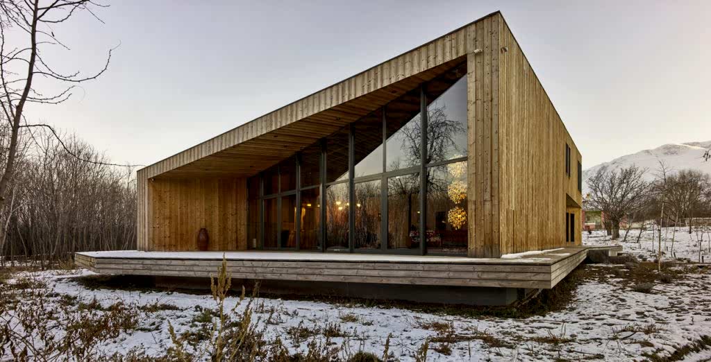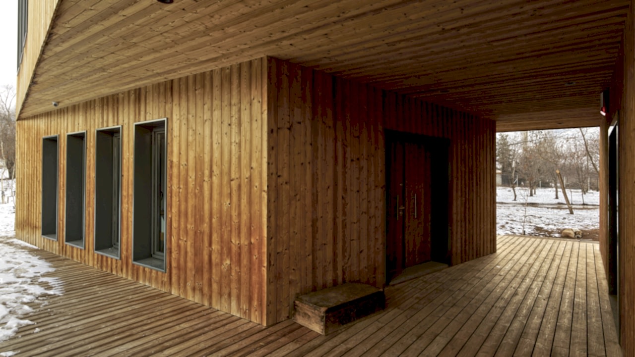 Tüm mekanların birbiri ile görsel ilişkisinin olduğu bu atölye/ev tek bir kütle olmasına rağmen atölye kısmı dışarıdan ayrı girişli olarak planlanmıştır. Bu da atölye ve evin girişlerinin ortak bir saçak ile çözümünü gerektirmiştir. Kütlenin ortasında yaratılan bir boşluk eve farklı yönlerden yaklaşımda, farklı mekanlara girişi çözmüştür. Böylece Erzincan’ın soğuk ve karlı kış mevsiminde kapı önleri korunaklı kalmış, ev ise arazinin ortasında kalmasına rağmen arazinin derinliğini engellememiştir.