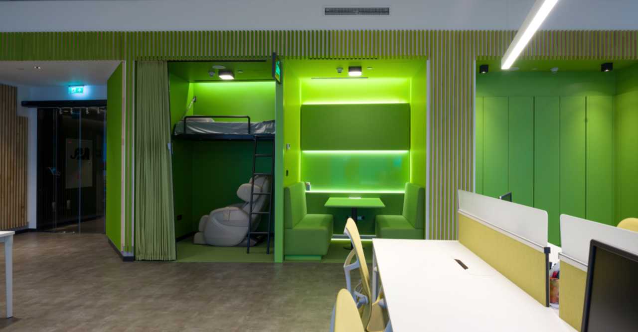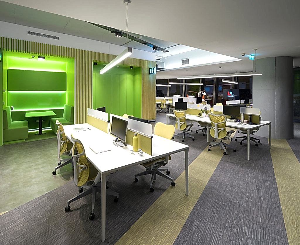 76 kişinin çalıştığı ofisin genç çalışan profili düşünülerek canlı, doğal renkler ve malzemeler kullanılmıştır. Seçilen malzemelerin çevre duyarlılığına özellikle dikkat edilmiştir.