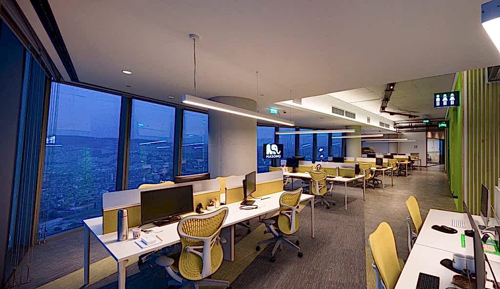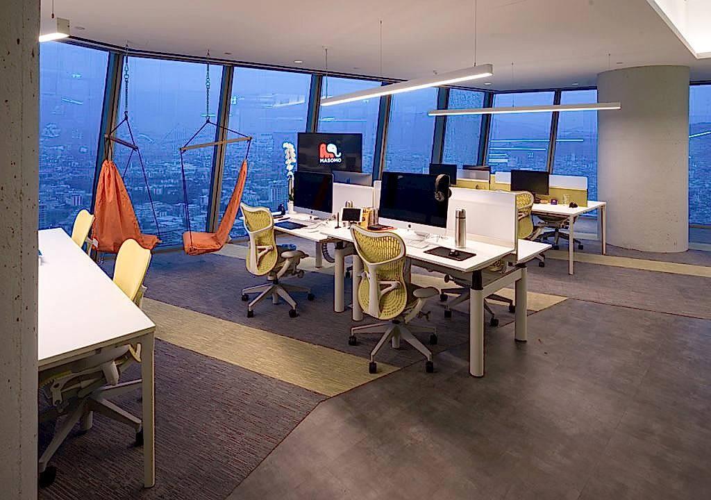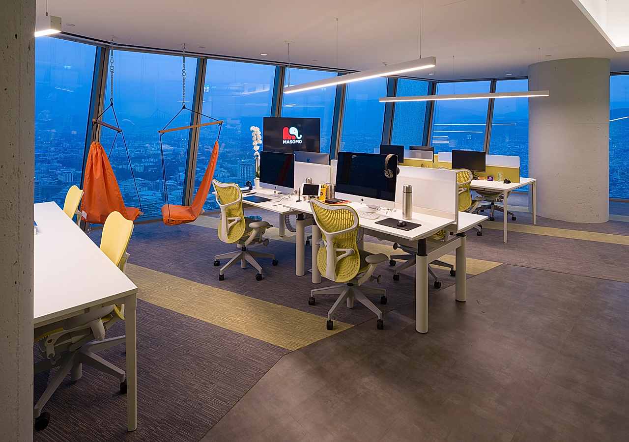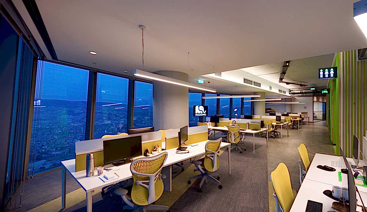 Masomo’nun yeni ofisi Mistral Plaza 42.katta, 800 m² lik bir alanda yer almaktadır. Ofis, kat planında ortada konumlandırılmış çekirdek sayesinde panoramik İzmir Körfezi manzarasına sahiptir. Ortak kullanım alanları olan tribün, PS oyun alanları, basketbol ve masa tenisi manzaranın en güzel olduğu yerde konumlandırılmıştır.