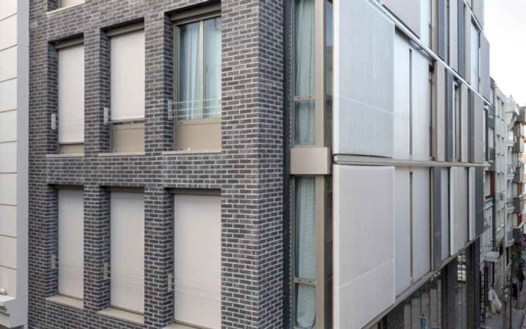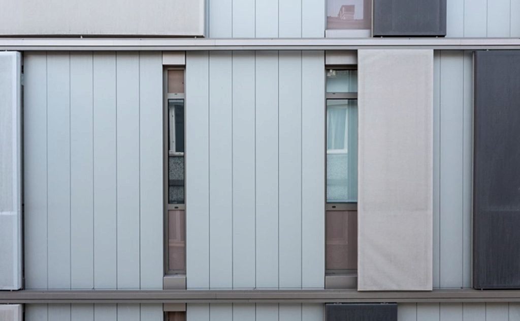 Projenin cephe tasarımında daha önce kullanmadığımız ürünler araştırarak ve tercih ederek, malzeme kütüphanemizin genişletilmesi amaçlanmıştır. Apartmanın ana kütlesinde alışılagelmiş bir cephe malzemesi olan tuğla kullanılırken, apartmanın konsol olarak çıkan uzun cephesinde bulunan çıkma yapan konsolun cephesinde SinterFlex cephe kaplaması ve dev kayar kumaş paneller kullanılmasına karar verilmiştir. Kayar panellerin bu şekilde güneş ışığını istenilen oranda kesebilmesi planlanmıştır. Bu süreçte panellerin ağılıkları hesaplanarak sağlam ve kullanışlı bir cephe sisteminin nasıl elde edileceği konusunda çalışmalar yapılmıştır. Bu özgün cephe tasarımı ile binanın mahalle de yenilikçi bir doku yaratması amaçlanmıştır.