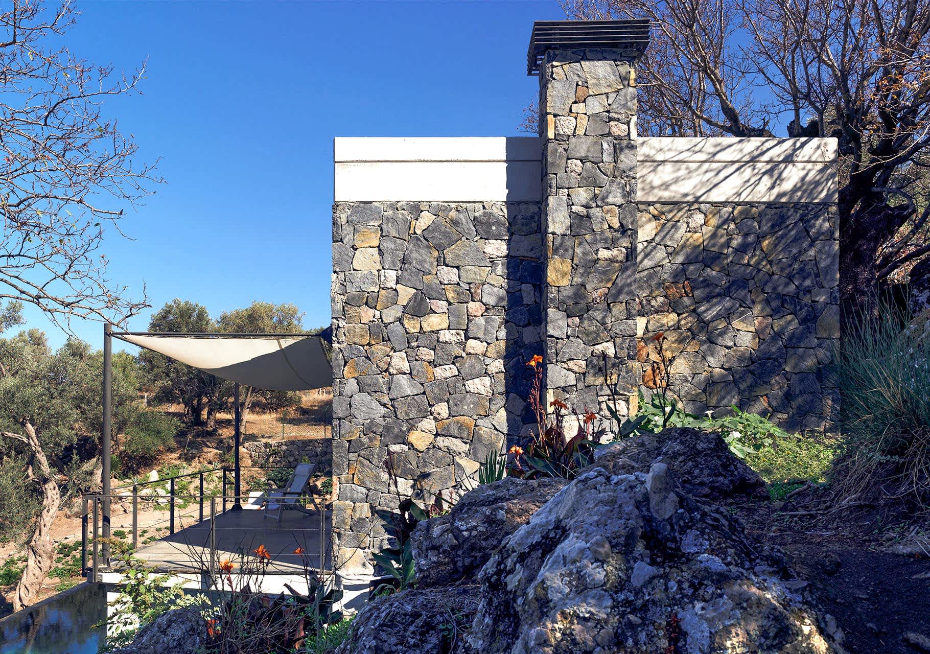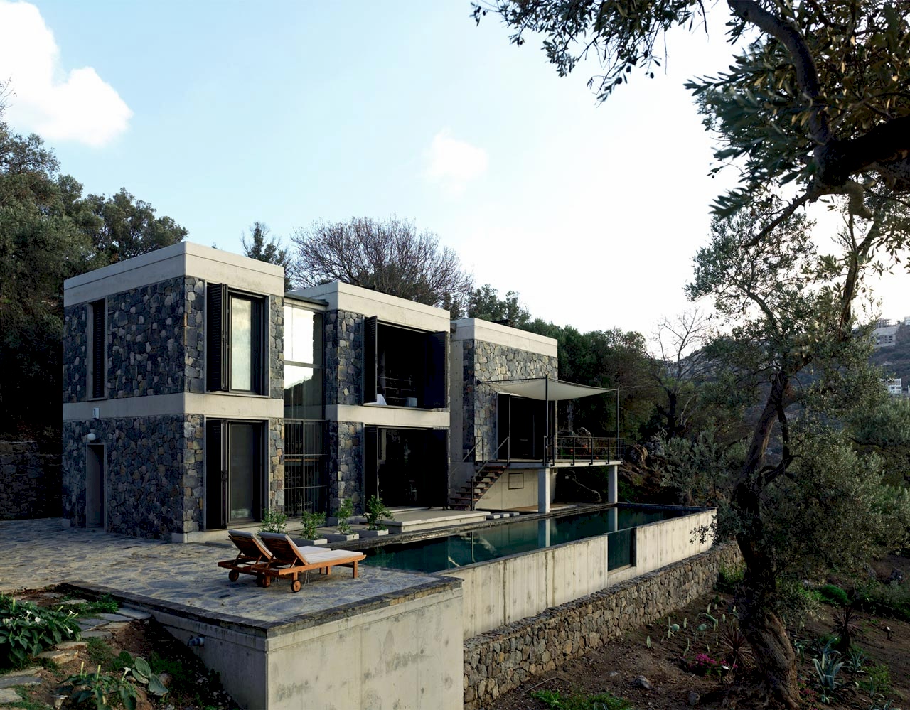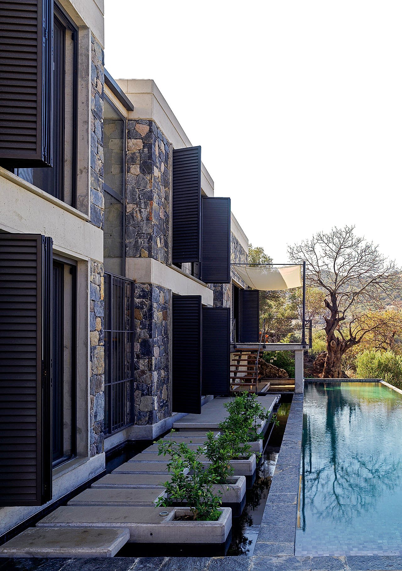 Bina konumlandırılırken topografyaya olabildiğince az zarar verilmeye çalışılmış, havuz istinat duvarları oluşturmayacak şekilde bahçe ile ev arasına yerleştirilmiştir.