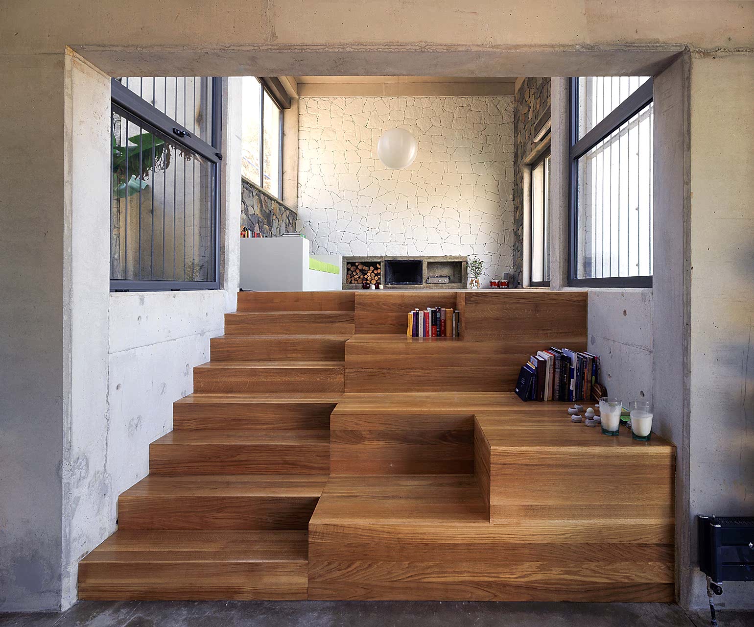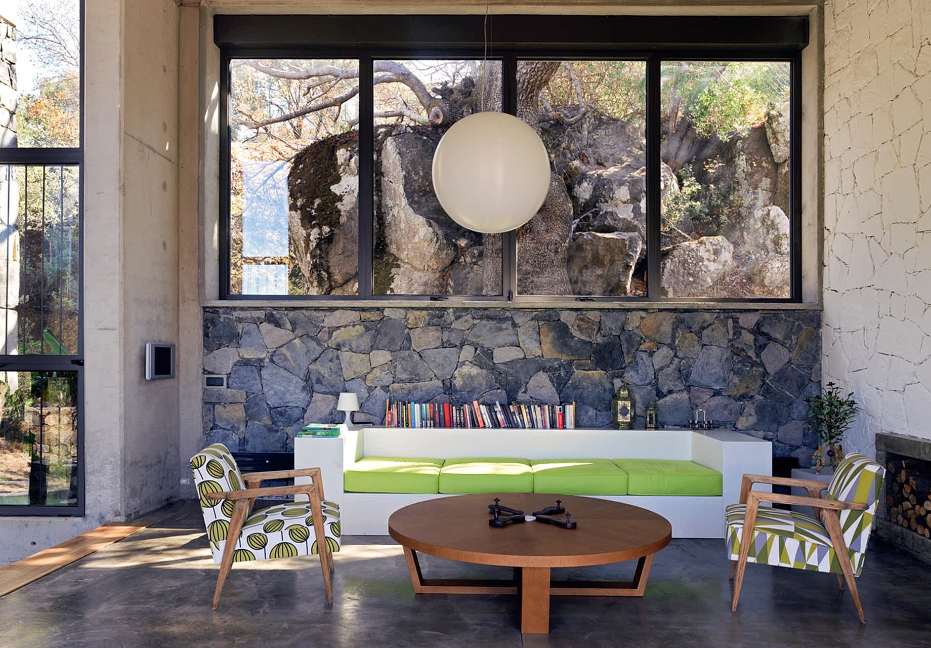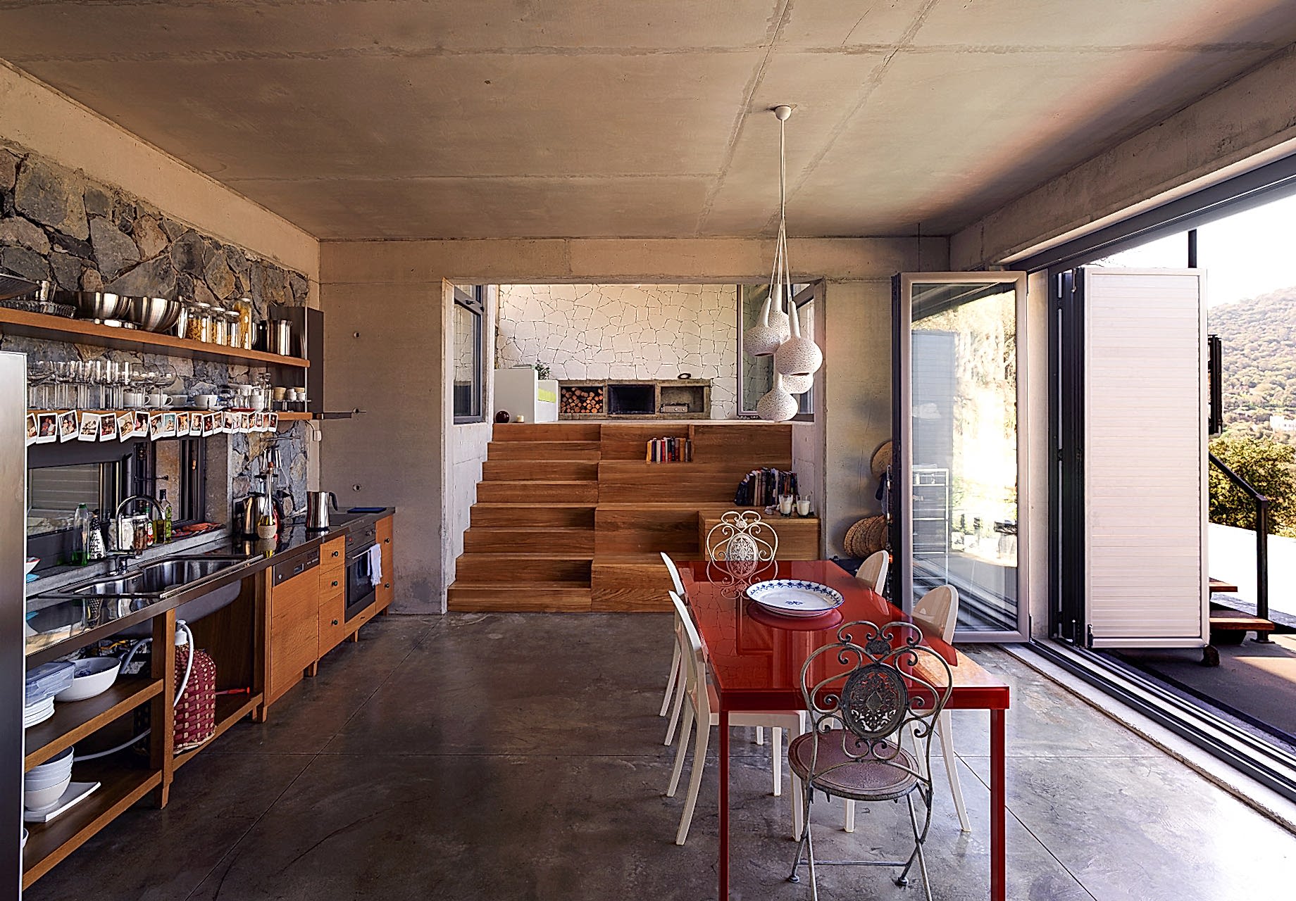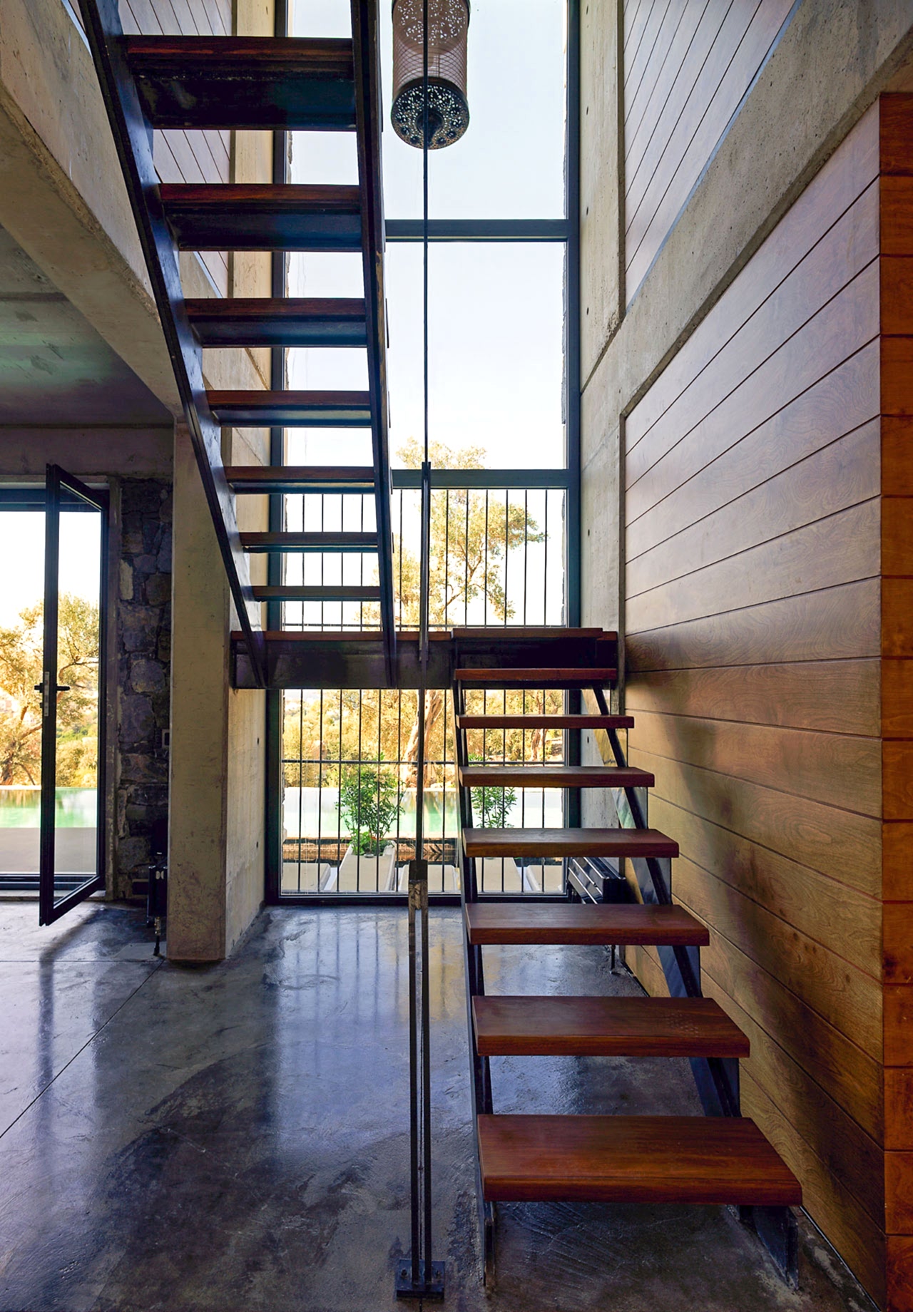 Bina konumlandırılırken topografyaya olabildiğince az zarar verilmeye çalışılmış, havuz istinat duvarları oluşturmayacak şekilde bahçe ile ev arasına yerleştirilmiştir.
