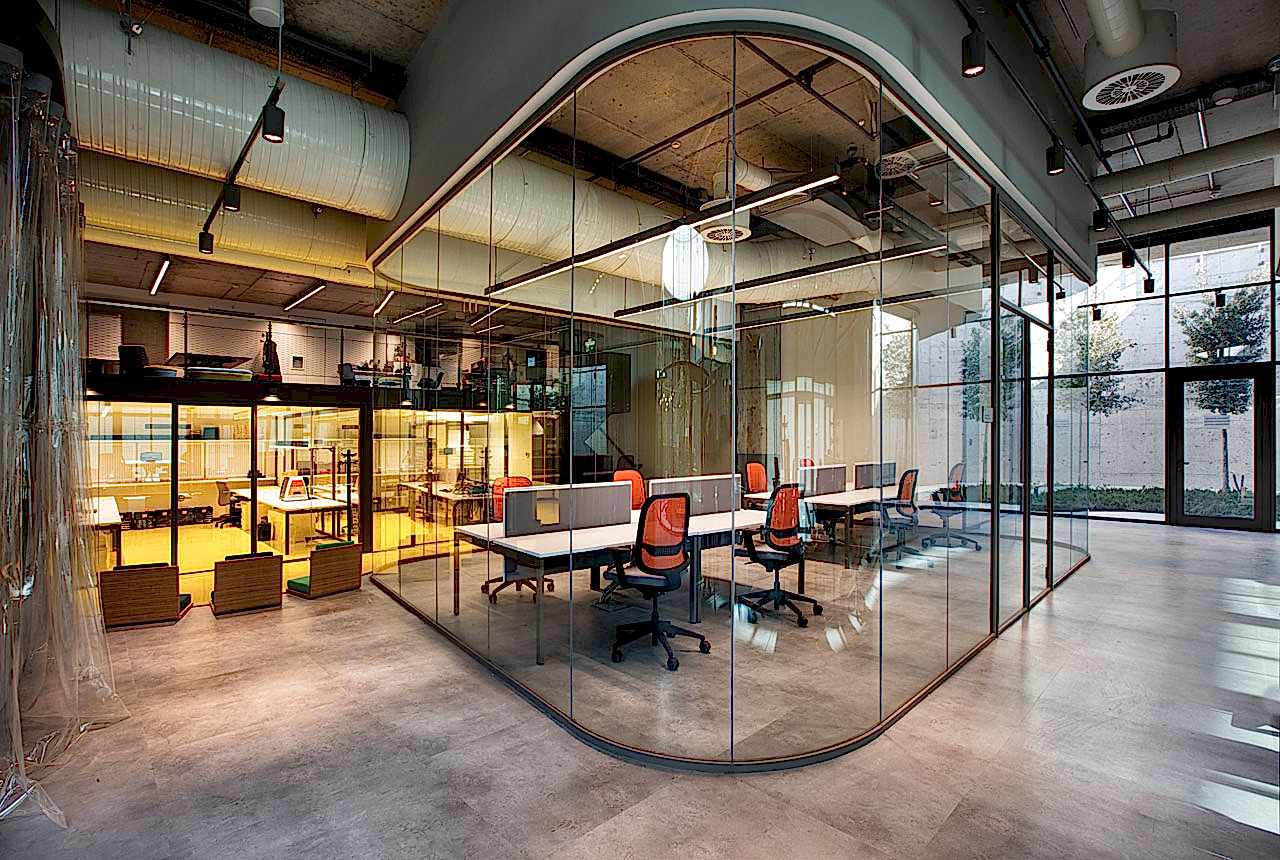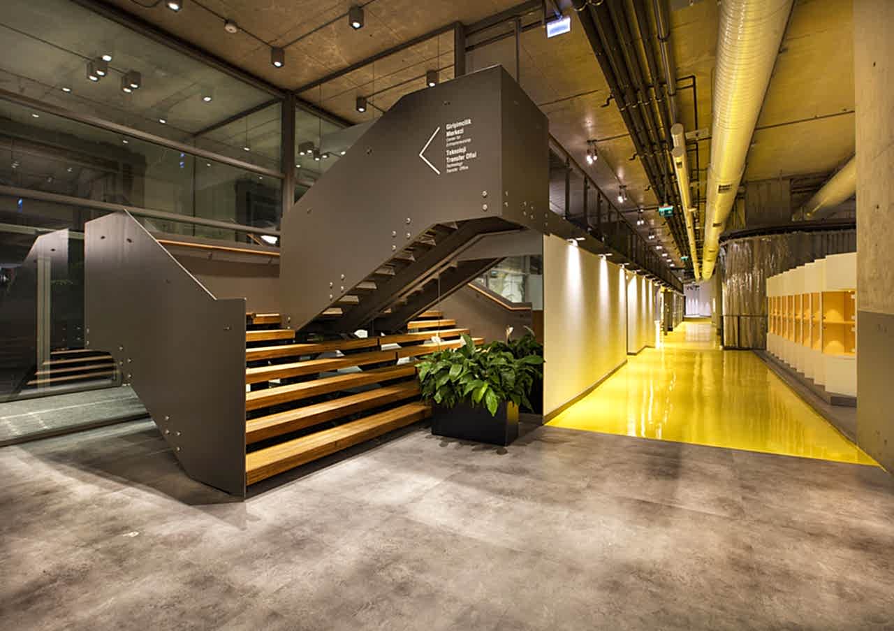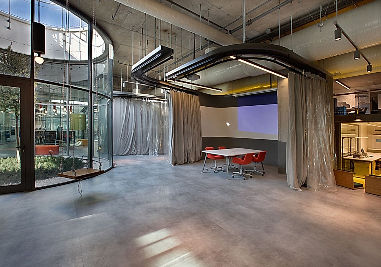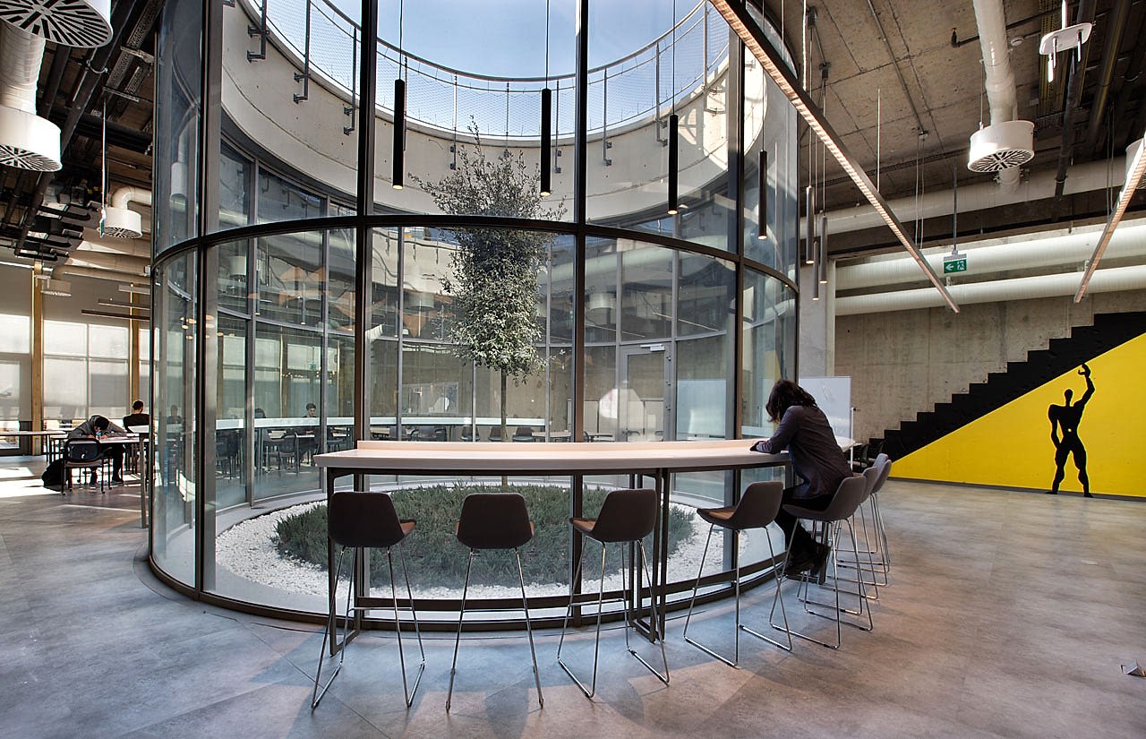 Toprak altına gömülü ES-LAB’in bulunduğu kot itibariyle varolan tek cephesi ve bu cephenin açıldığı bahçe, yürütülen programların iç ve dış mekan arasındaki sürekliliğinin sağlanması adına korunan unsurlardır. Yeni müdahalelerden biri olan “kanyon”, mekanın karşı tarafında yer alan bir rampa olup, bu inovasyon merkezinin ana girişi niteliğindedir. Tavan döşemesinde açılan dairesel açıklıklar iç avlular oluşturup, teras ve iç mekan arasındaki görsel ilişkinin kurulmasını ve içeriye ışık alınmasını sağlamaktadır.