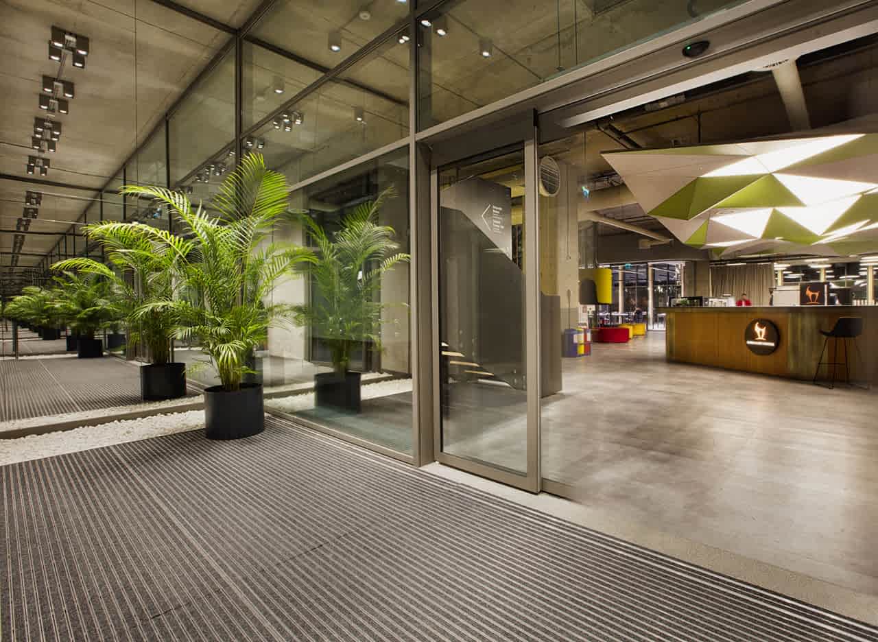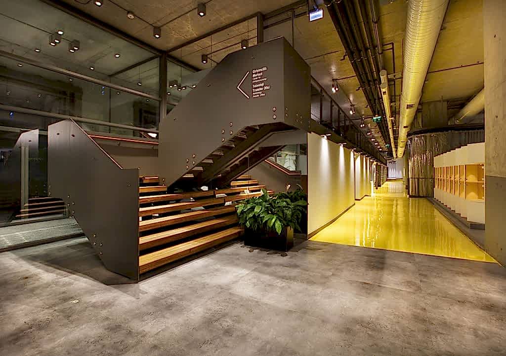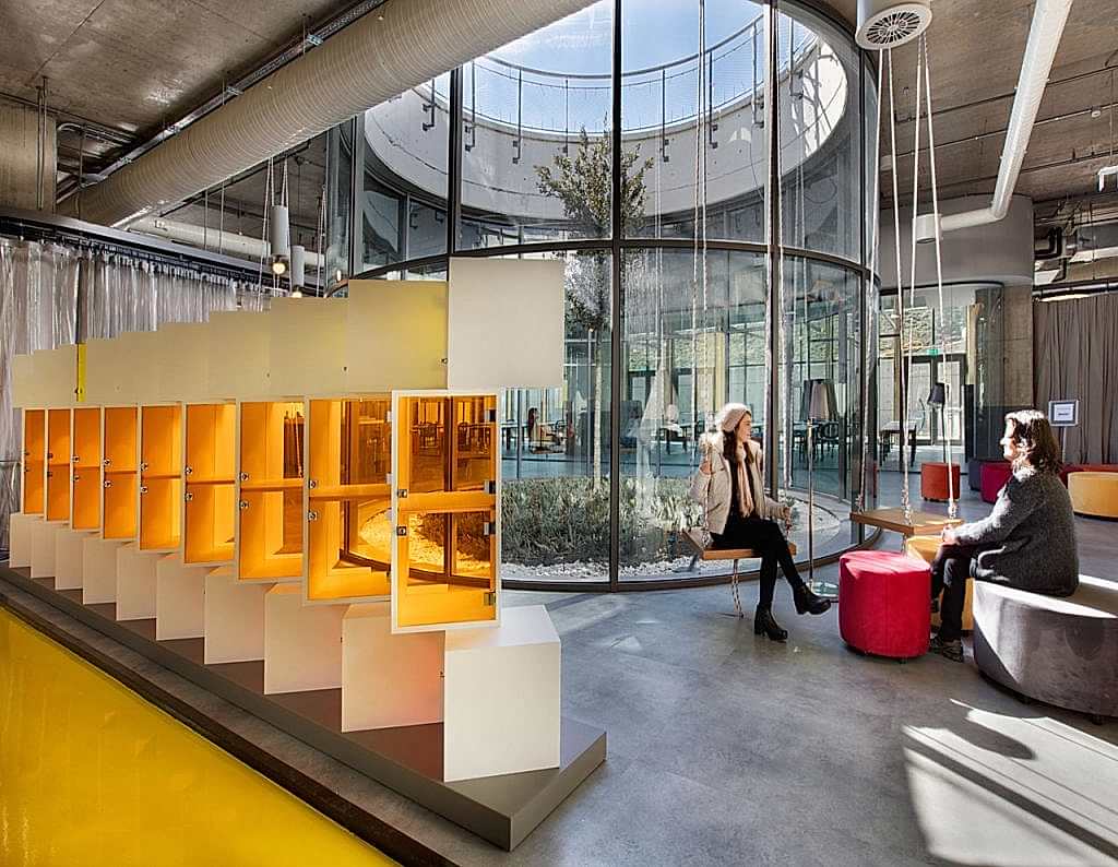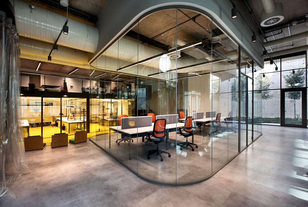 Toprak altına gömülü ES-LAB’in bulunduğu kot itibariyle varolan tek cephesi ve bu cephenin açıldığı bahçe, yürütülen programların iç ve dış mekan arasındaki sürekliliğinin sağlanması adına korunan unsurlardır. Yeni müdahalelerden biri olan “kanyon”, mekanın karşı tarafında yer alan bir rampa olup, bu inovasyon merkezinin ana girişi niteliğindedir. Tavan döşemesinde açılan dairesel açıklıklar iç avlular oluşturup, teras ve iç mekan arasındaki görsel ilişkinin kurulmasını ve içeriye ışık alınmasını sağlamaktadır.