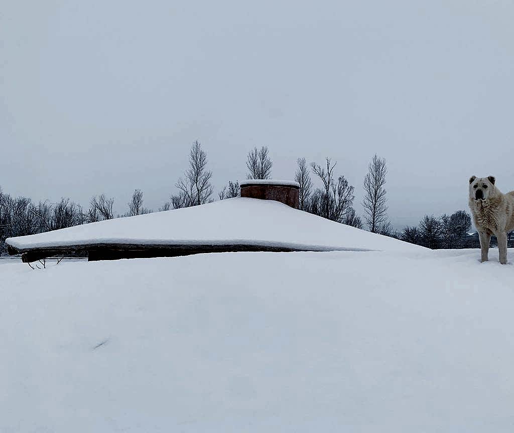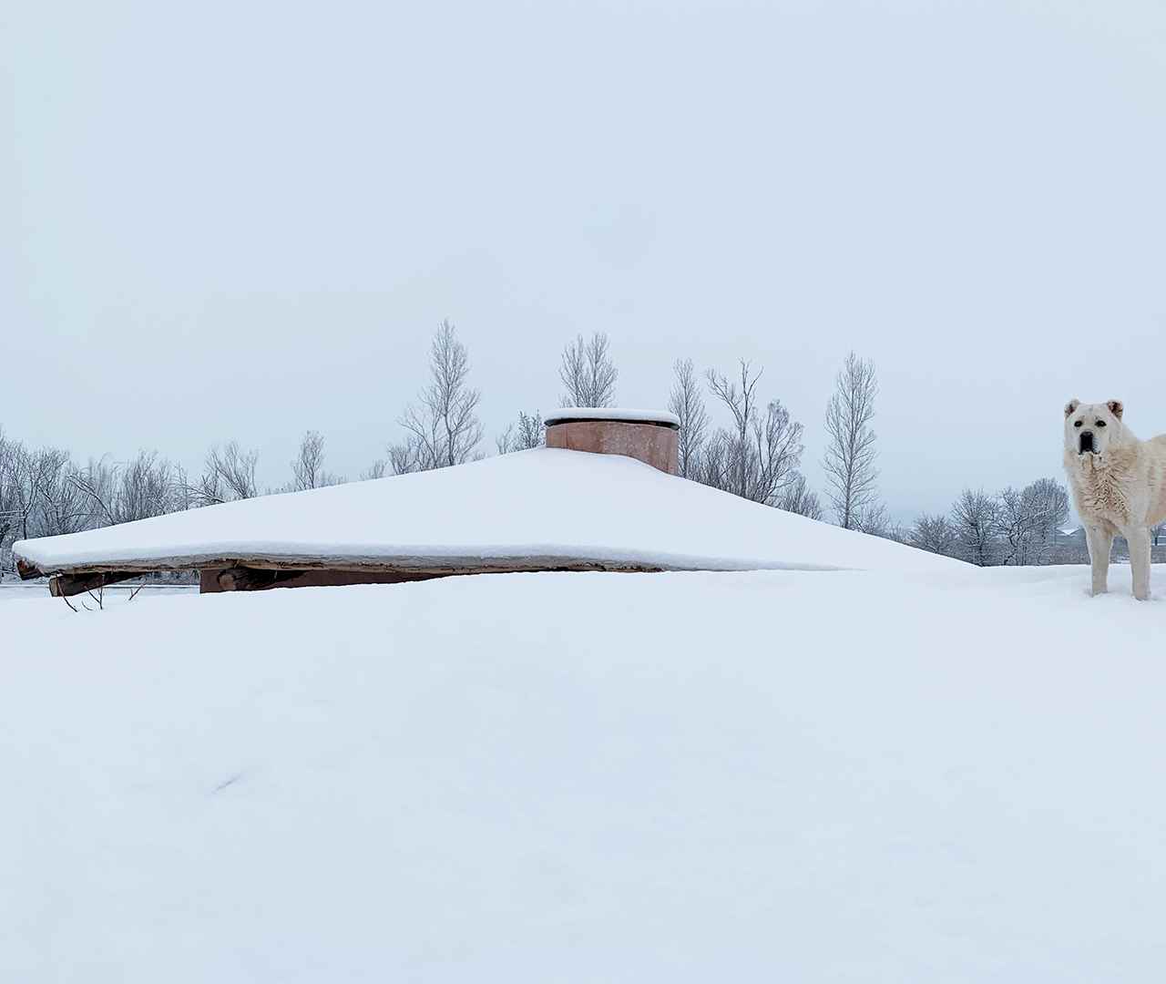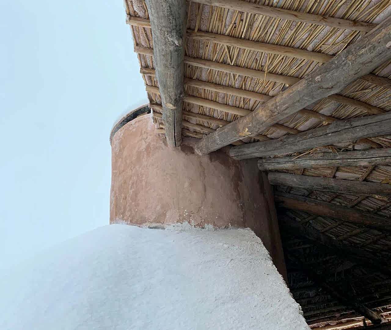 Çatı kaplaması çalı çırpı, jüt ve toprak malzemelerden oluşturulmuştur ve kar yüküne karşı yüksek eğim derecesi ile detaylandırılmıştır. Arkeolojik restorayon tekniği ile su sızdırmayan ve bakım gerektirmeyen bir katman oluşturulmuştur. Karışımın içinde hidrolik kireç, kaymak kireç, perlit kumu, alçı ve kiremit tozu yer almaktadır.
