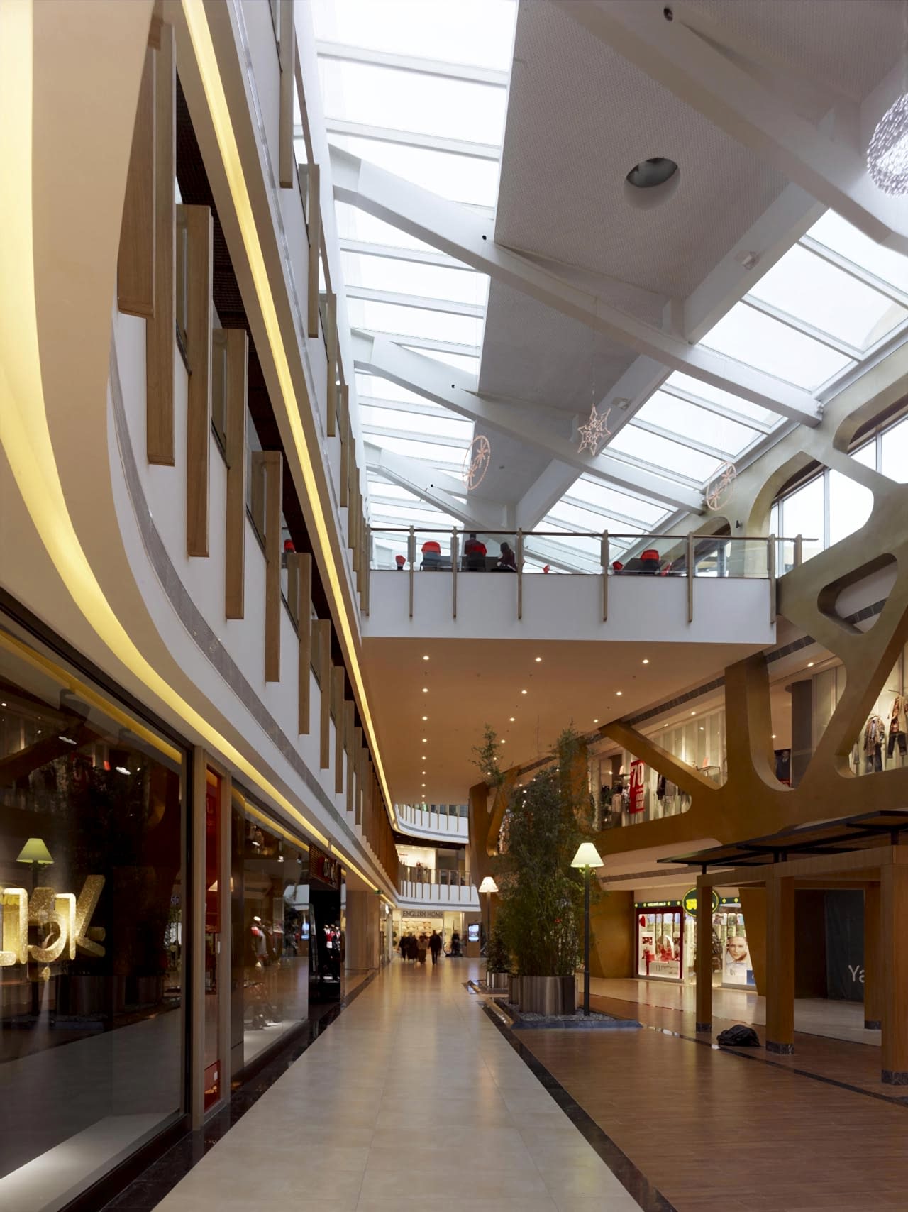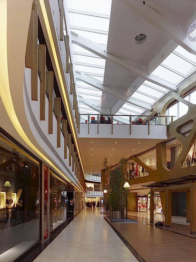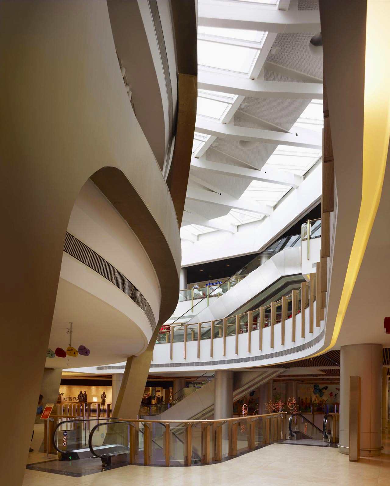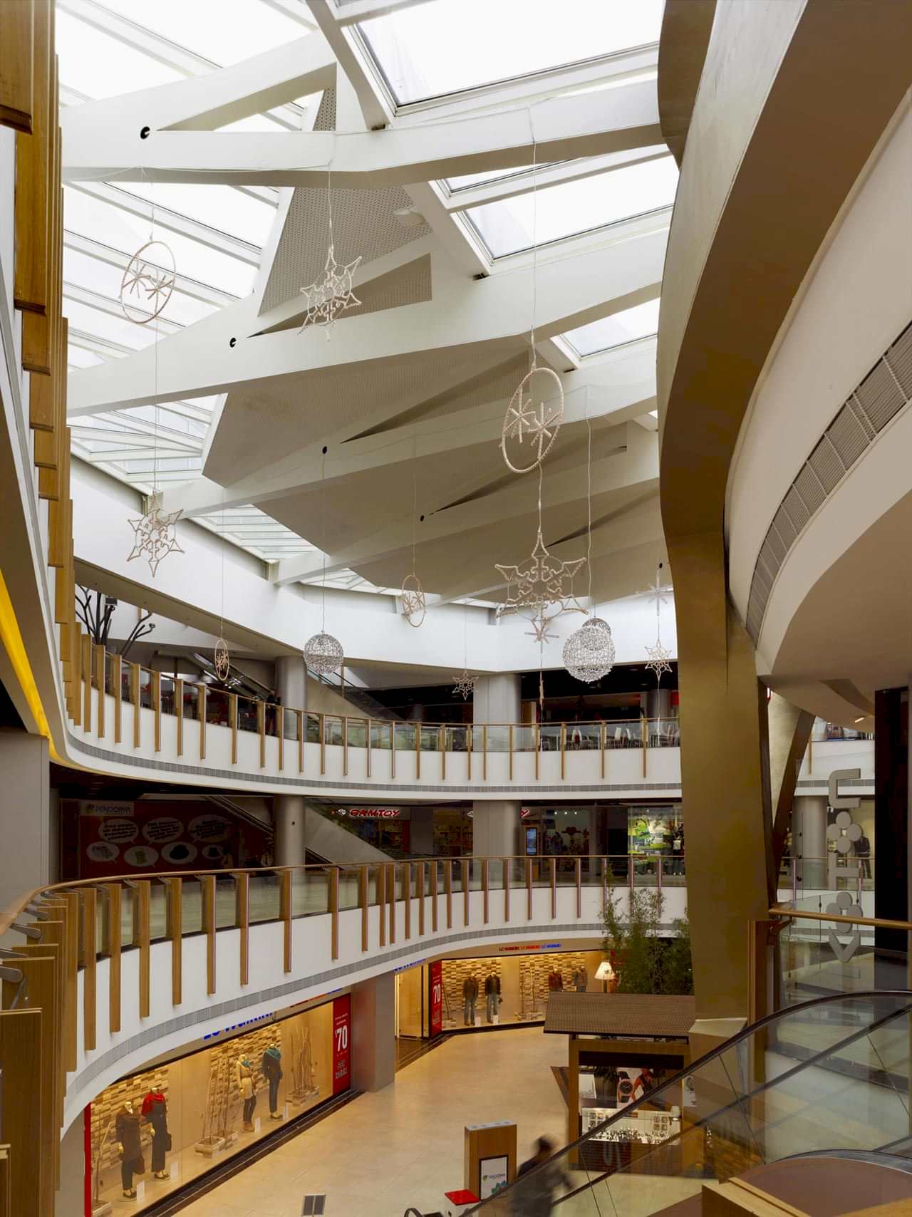 İç mekanın ortasında çatıyı da taşıyan dev strüktürün çevresinde her katta değişen planimetri ve geri çekilmelerle sağlanan değişken iç boşluk zengin perspektifler yaratmakta ve mağazalar arası görsel ilişkiyi kuvvetlendirmektedir. Çatı avlusunda oluşturulan meydan yeme içme alanlarına değer katarken, avm iki açık meydan arasında bir sirkülasyon mekanı olarak çalışır.
