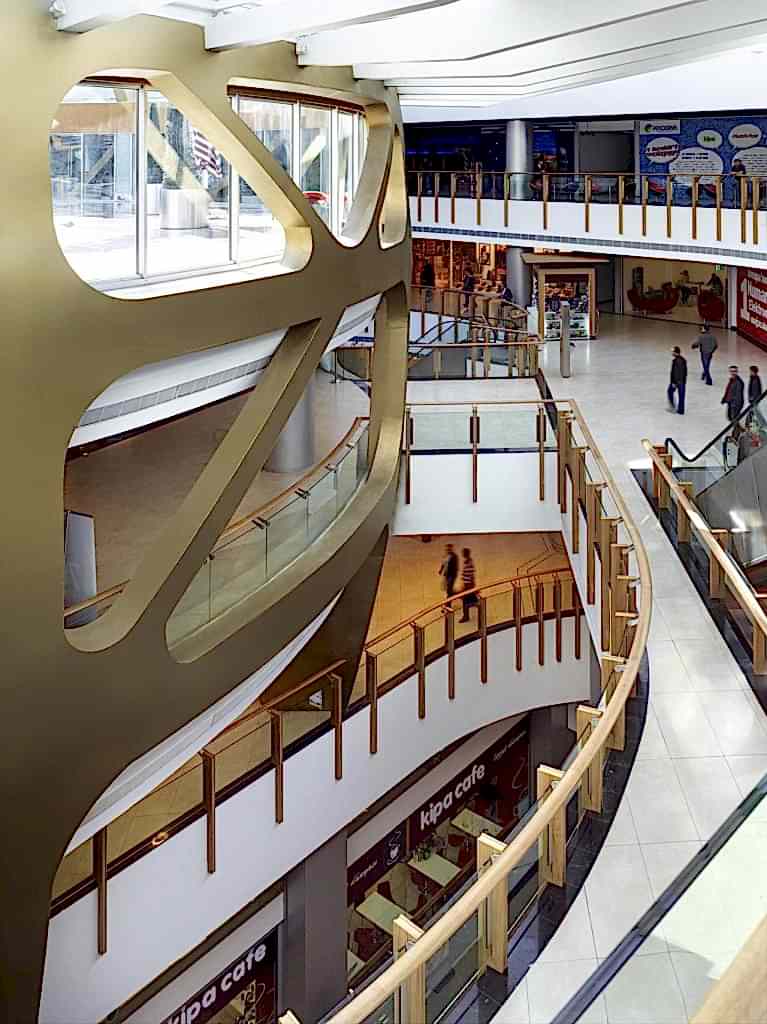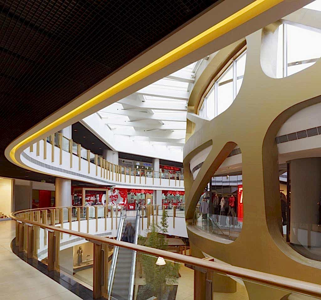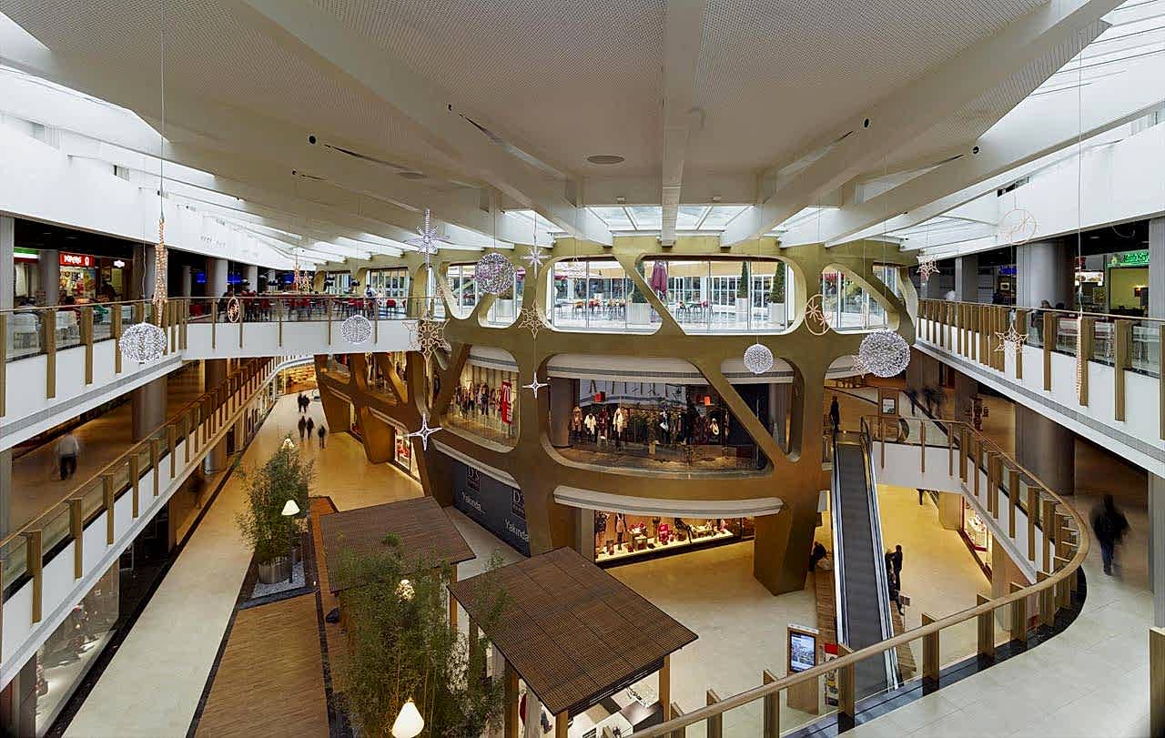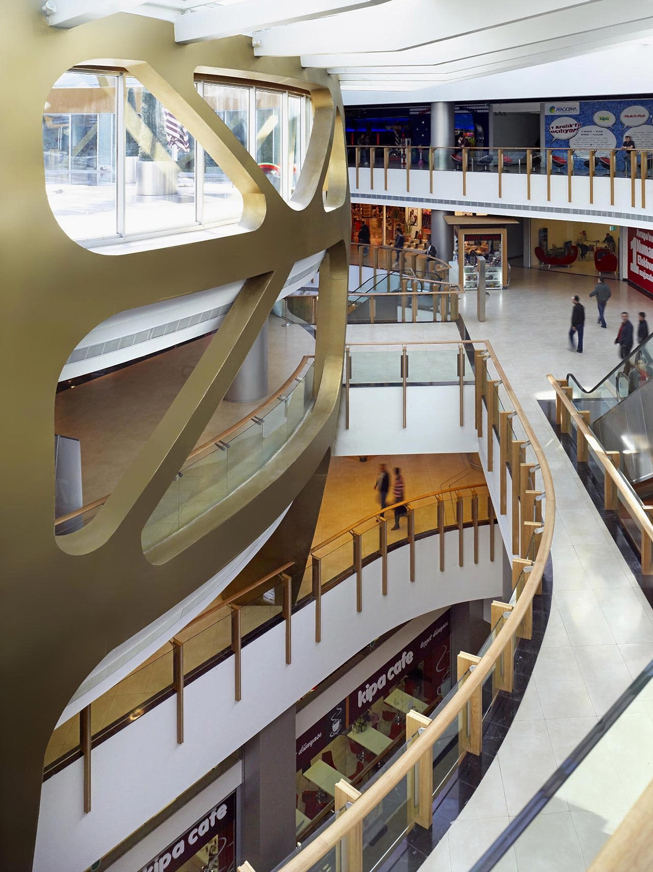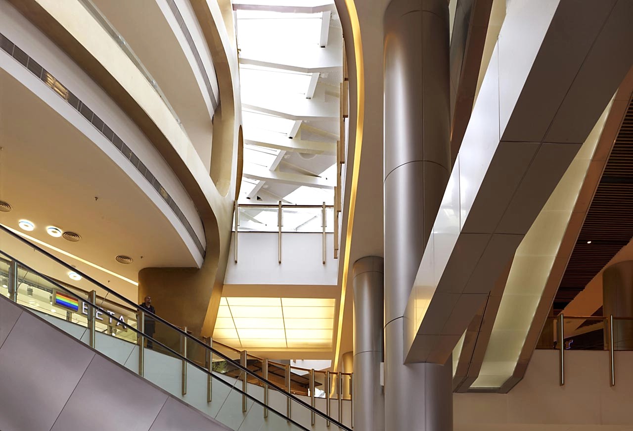 İç mekanın ortasında çatıyı da taşıyan dev strüktürün çevresinde her katta değişen planimetri ve geri çekilmelerle sağlanan değişken iç boşluk zengin perspektifler yaratmakta ve mağazalar arası görsel ilişkiyi kuvvetlendirmektedir. Çatı avlusunda oluşturulan meydan yeme içme alanlarına değer katarken, avm iki açık meydan arasında bir sirkülasyon mekanı olarak çalışır.