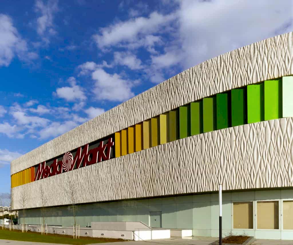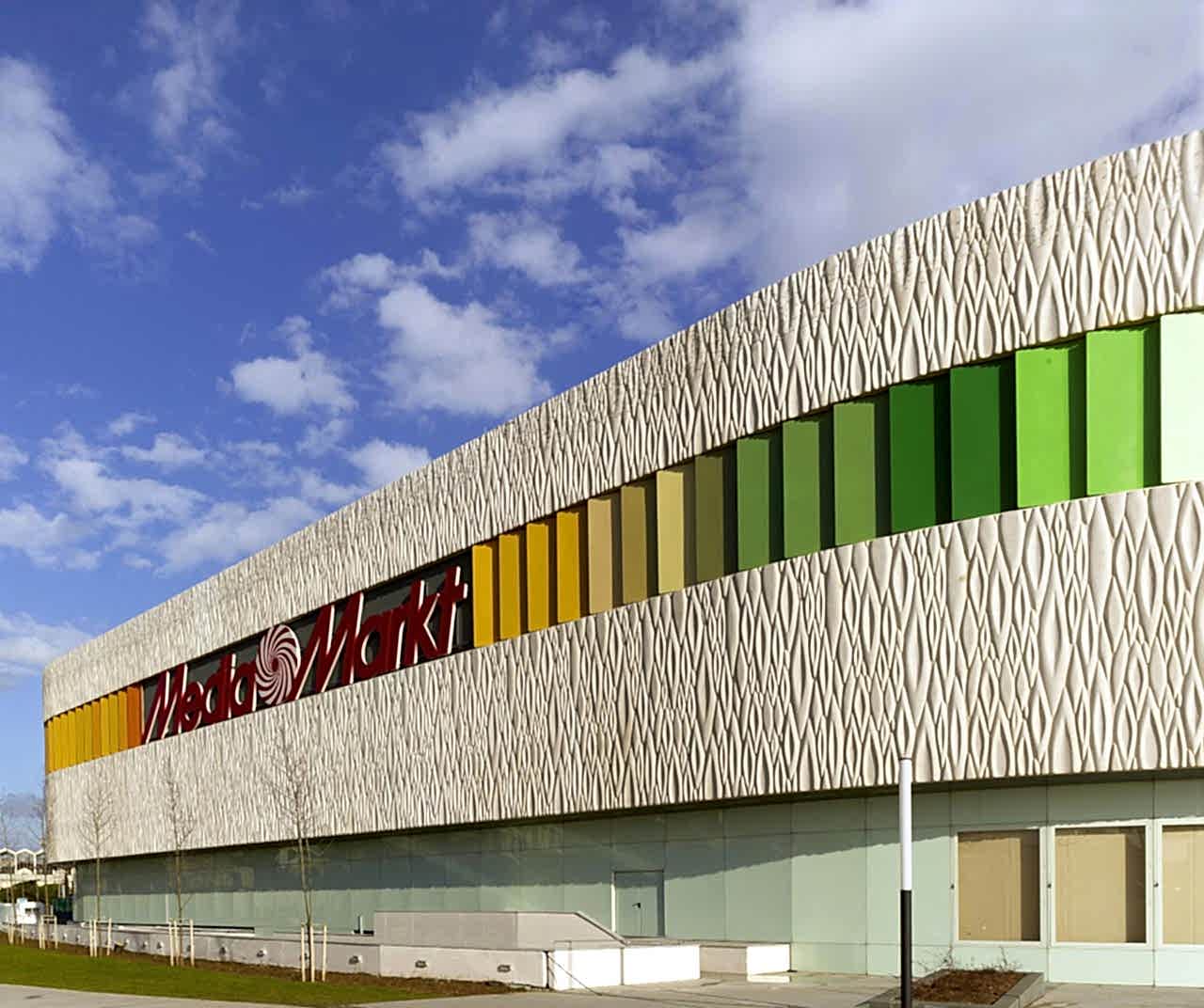 Bina dış cephesi, araç trafiğinin yoğunluğu ve hızı göz önüne alındığında kolay algılamayı sağlayacak yatay logo bandıyla çevrelenmiştir. Dış cephe zemin katta cam panellerle, üst katlarda ise kuvvetli görsel etki ek göstermeyecek şekilde tasarlanan desenli beton prekast panellerle kaplanmıştır. Böylece hem uzun süreli bakım kolaylığı sağlanırken hem de görsel bütünlük elde edilmektedir.