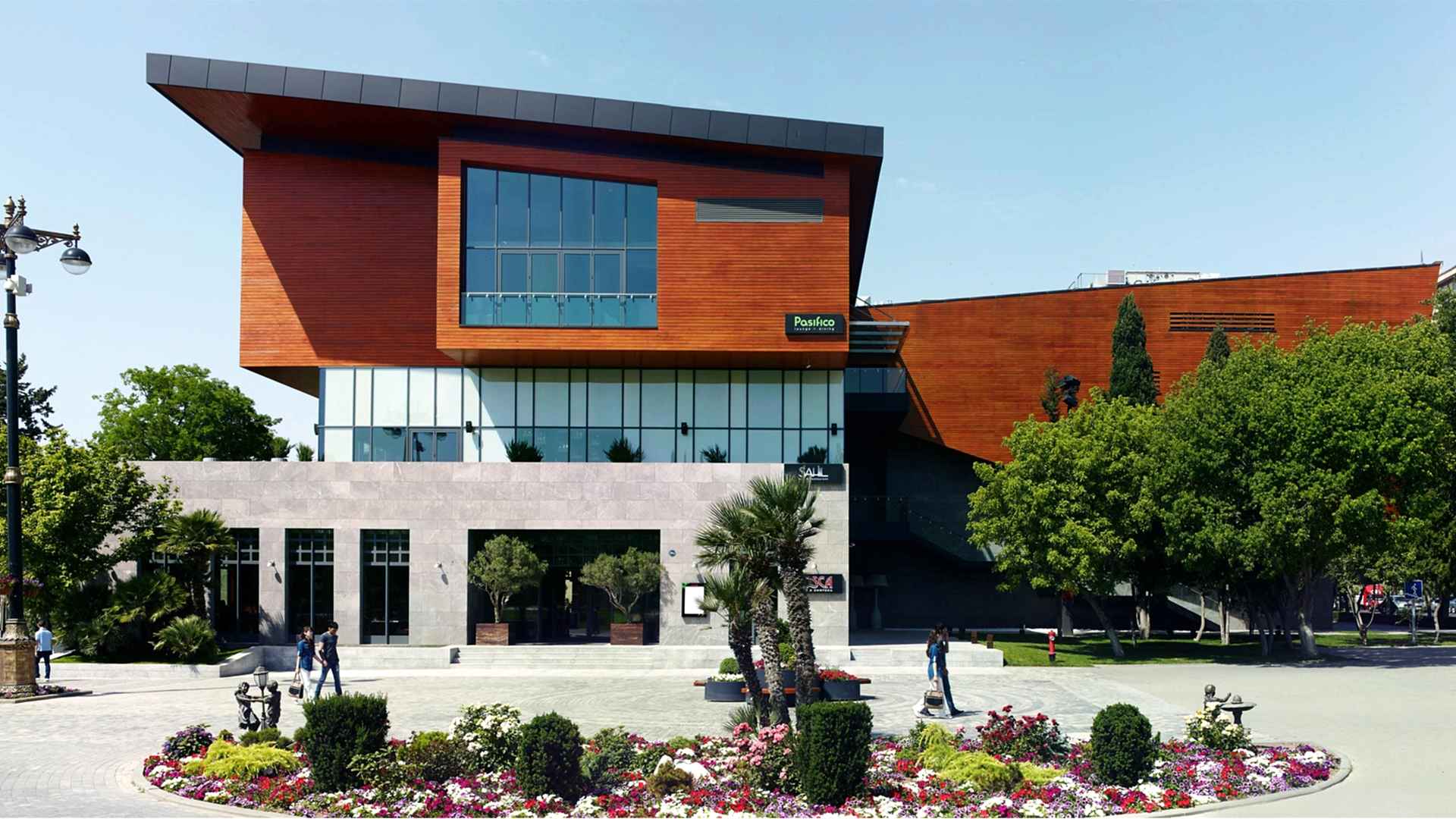 The goal of the project was to define the three establishments with three separate entrances while reflecting this distinction harmoniously on the façade. As a trattoria, TOSCA is distinguished with stones, the seafood-oriented SAHİL, which translates as seashore, by light blue glass reflecting the Caspian Sea, and the Brazilian PASIFICO with wood alluding to the Amazon.