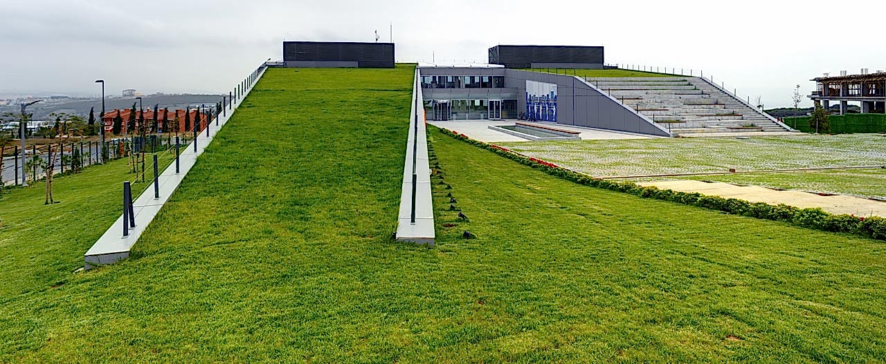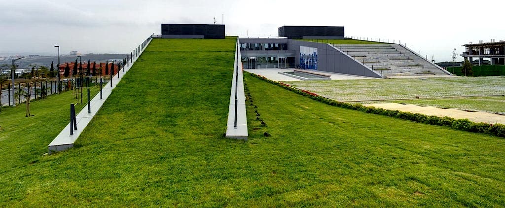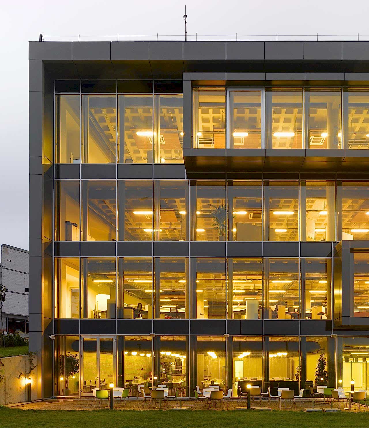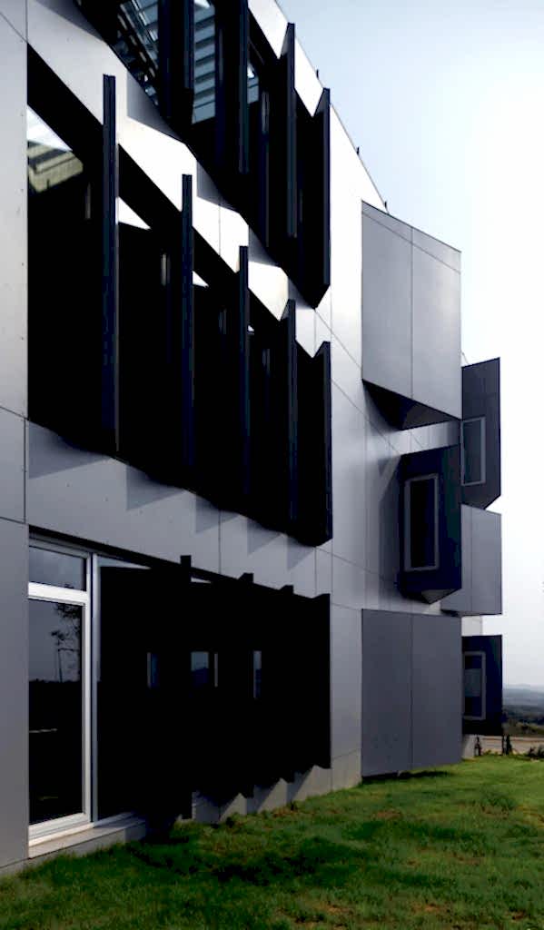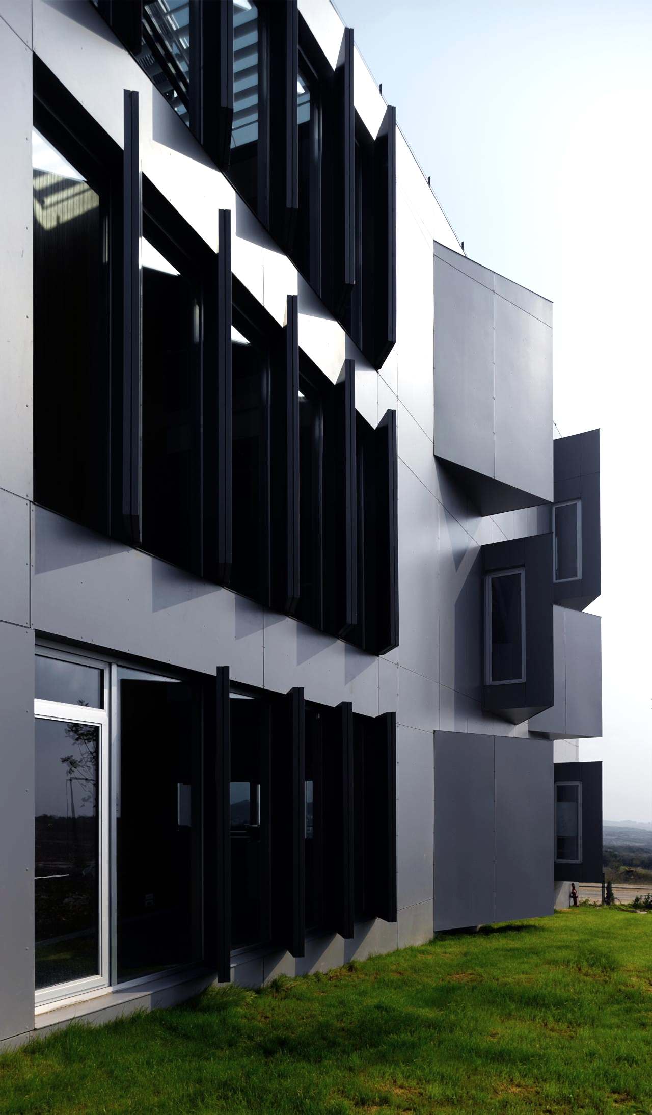 Bu kurguda yüksek tarafı ofis alanları oluşturur ve toprağa bakan kısımlar çatıdan aşağı yaratılan büyük boşluktan ışık alır. Çatı ışıklığı hattı yan cephelerde de iki yöne doğru üçgen açılan pencerelerle devam eder. Böylece ofis mekanları dört tarafından doğal ışığı kontrollü bir şekilde alırlar. Yapı bir peynir dilimi gibi arazi ile ilişkilenir ve çim çatısı ile topraktan çaldığı alanı rekreasyon alanını olarak çalışanlara geri verir.
