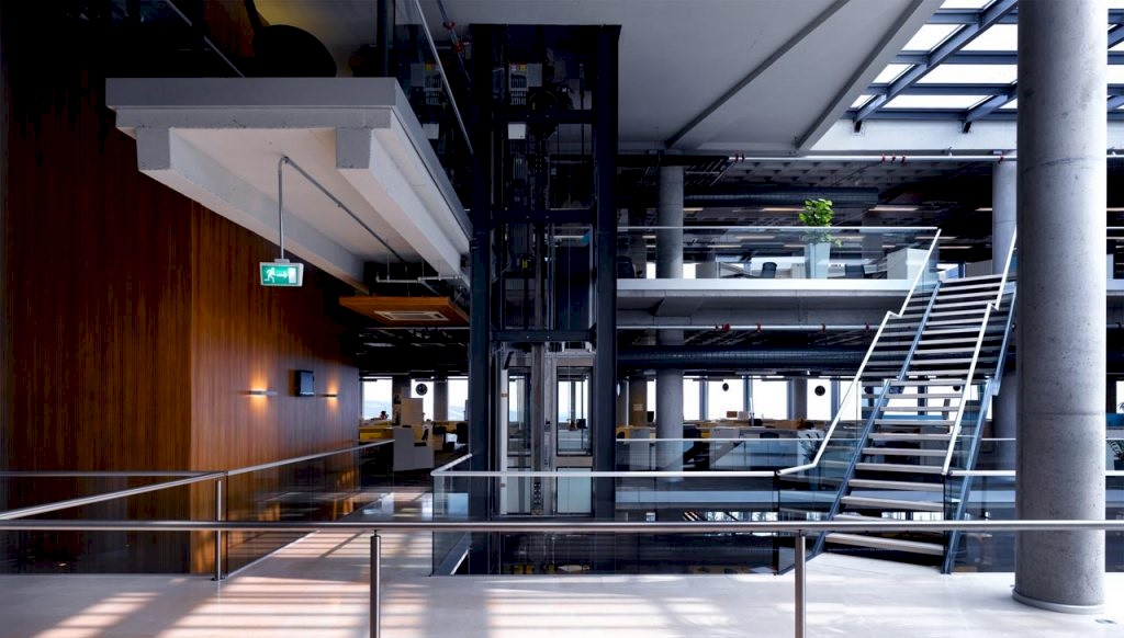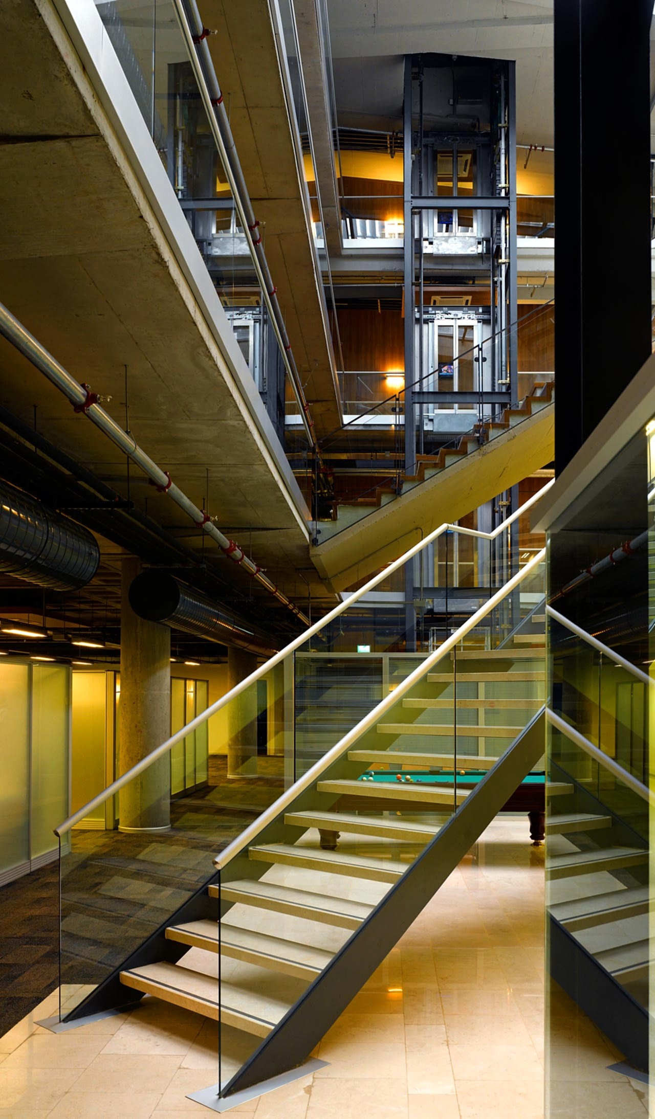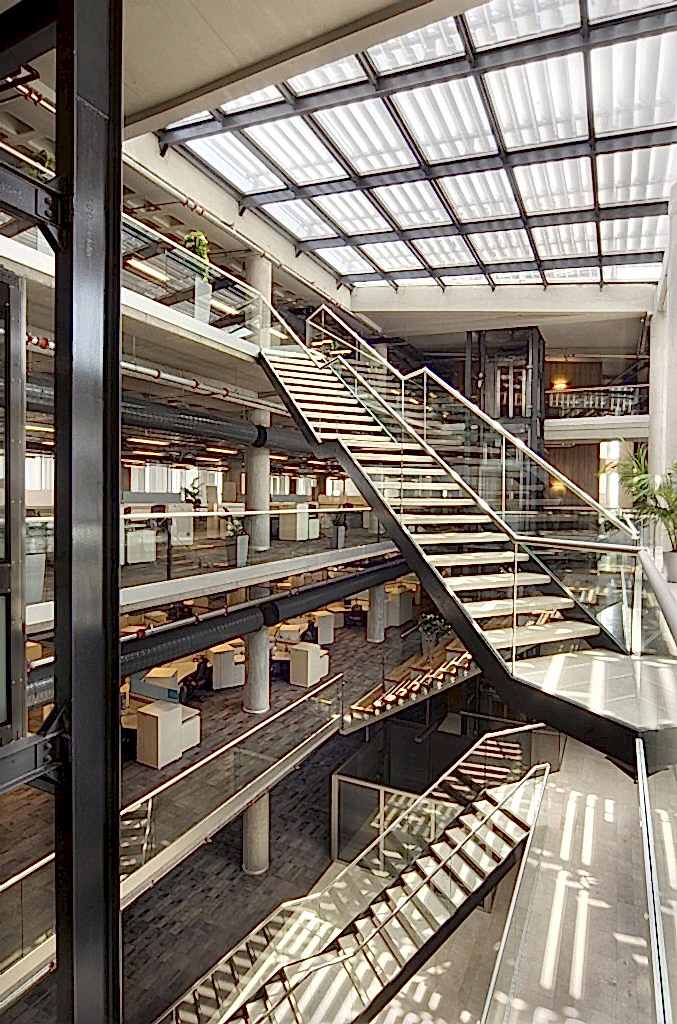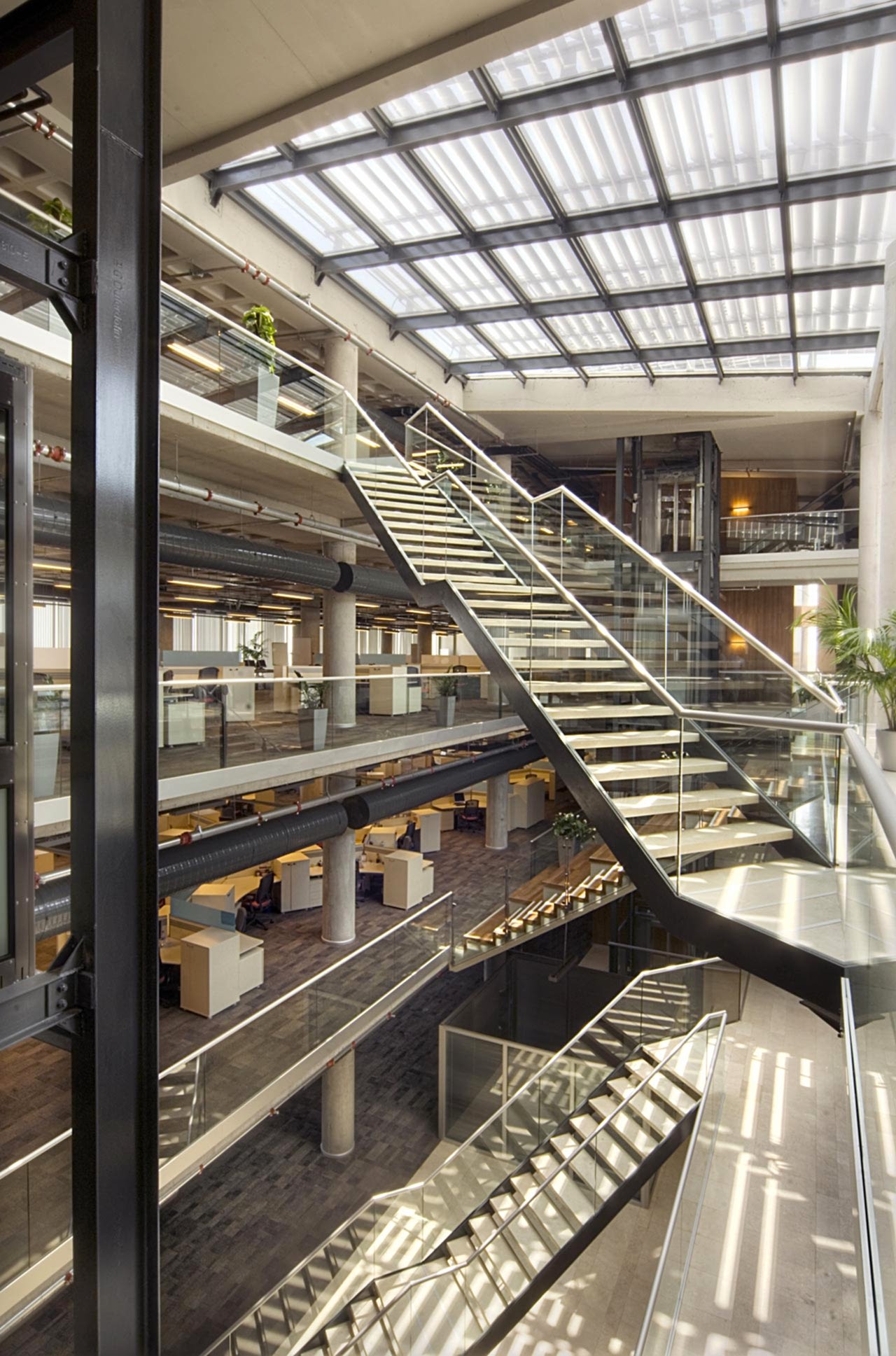 Binanın iç boşluğu ışık almanın yanı sıra tüm sirkülasyon işlevlerini de organize eder. Boşlukta giden cam asansörler, katları birbirine bağlayan değişik arketiplerdeki merdivenler iç mekandaki boşluğa farklı perspektifler kazandırır.