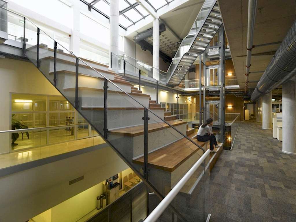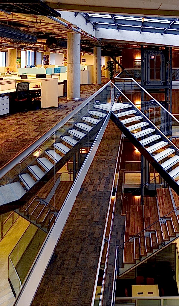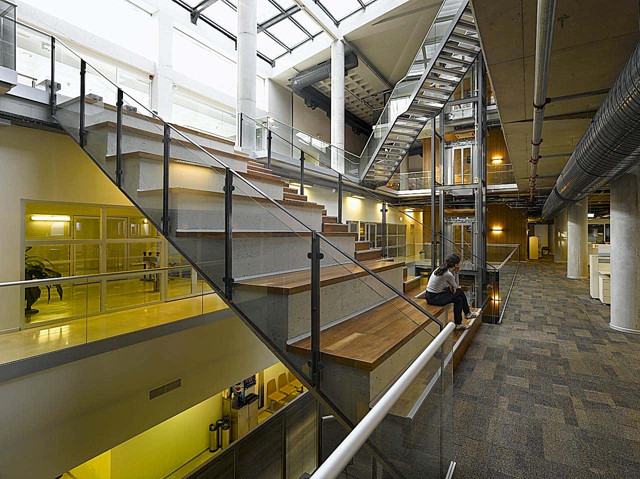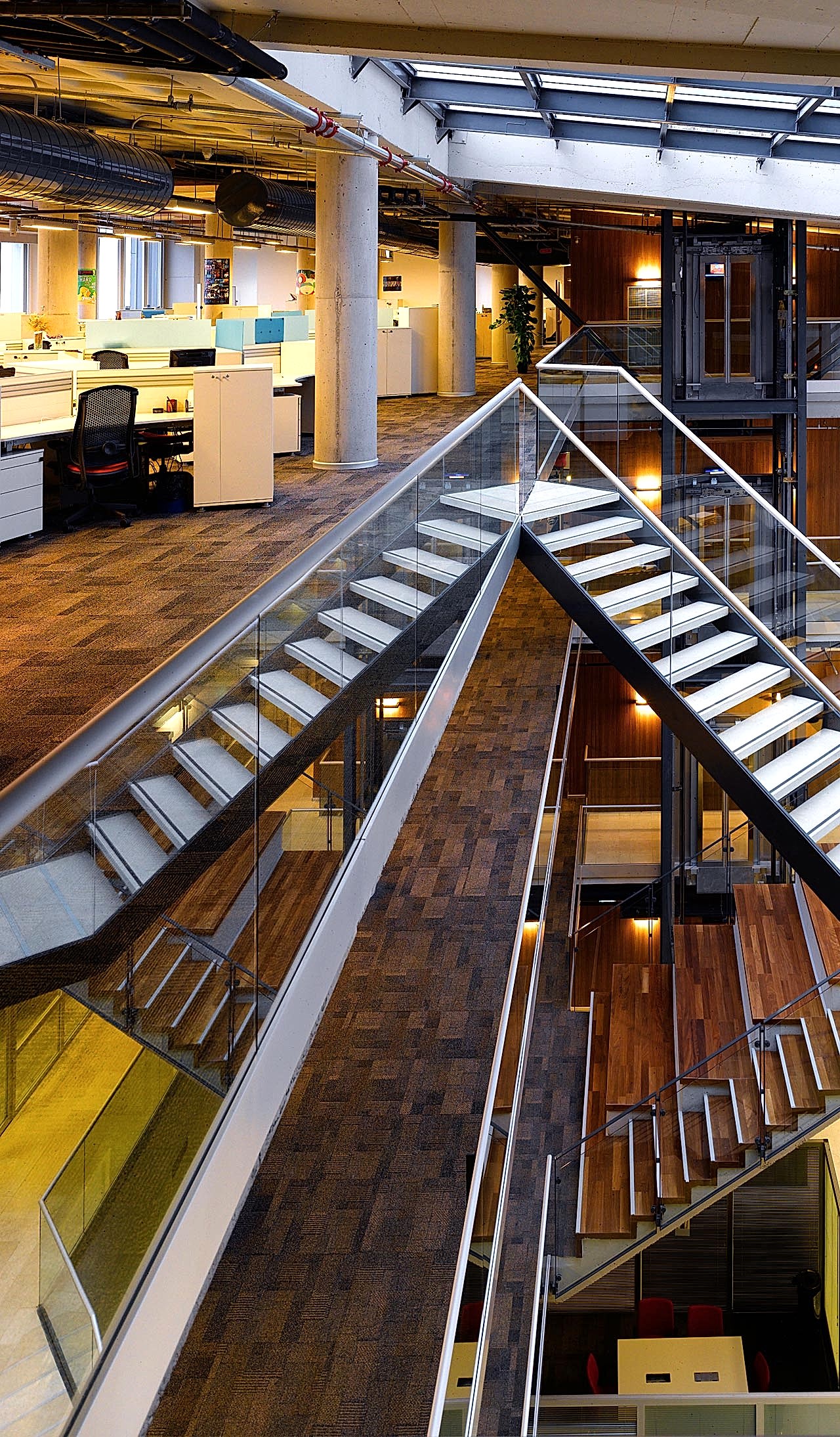 Binanın iç boşluğu ışık almanın yanı sıra tüm sirkülasyon işlevlerini de organize eder. Boşlukta giden cam asansörler, katları birbirine bağlayan değişik arketiplerdeki merdivenler iç mekandaki boşluğa farklı perspektifler kazandırır.