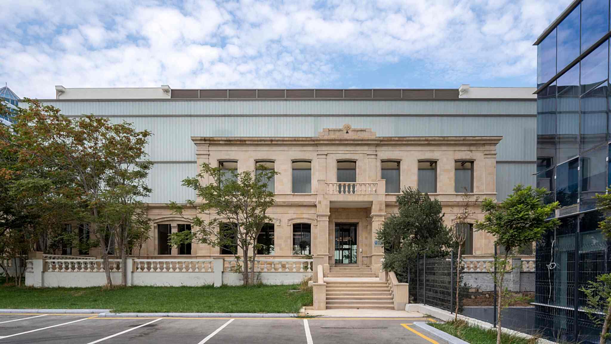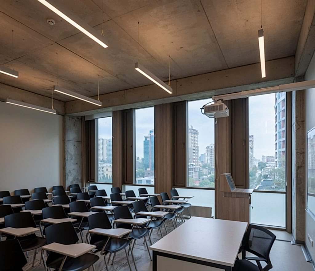 Derslik blokları için son derece ritmik, gridal bir cephe sistemi önerildi. Şehir tarafından algılanan cephede ekonomik sebeplerle Bakü nün alamet-i farikası bej kum taşı rengi ve dokusuna yaklaşan bir terracotta kaplama kullanıldı. İçinde temizlik ve bakım için dar sağır kanatları olan bir pencere sistemi önerildi. Bu şekilde sabit açılmayan geniş camlardan ışık alırken profil maliyeti düşürüldü. Sokak tarafında bu gridal sistem korunarak daha mütevazı bir malzeme ile kaplandı ve sağırlıklar arttırıldı.
