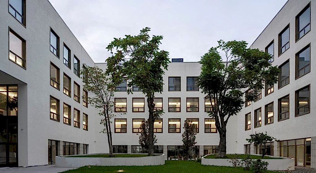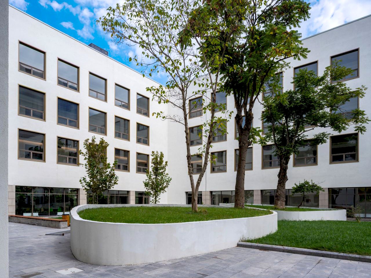Sokak sınırındaki yüksek ağaç gövdelerine öykünen ince kolonlar, giriş boşluğunun üzerinde devam eden yapıyı taşıyarak bu ölçeği bozmadan görkemli bir öğrenci girişi oluşturuldu. Avludan öğrenci işleri, sınıflar, yemekhane ve kütüphane/medyatek gibi farklı fonksiyon bloklarına ayrı ayrı erişim sağlandı. Bu şekilde sosyal alanlar olan yeme-içme işlevi veya çalışma- okuma alanları bahçe ile hemzemin, park içinde ve manzaraya hâkim şekilde konumlandılar. Öğrenci işleri, kayıt işleri gibi resmi ofislerin de avludan geçişi sağlanarak avlu tüm ana işlevlerin erişimi olan bir açık sofa/eyvan gibi düşünüldü.