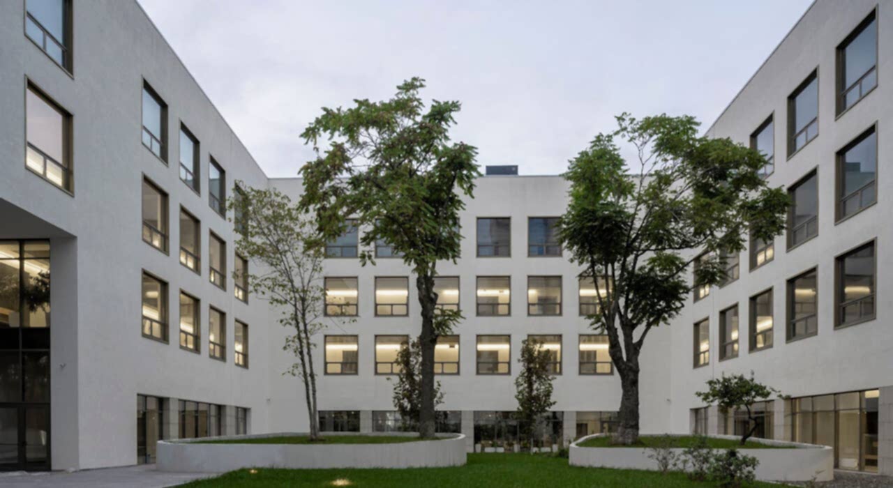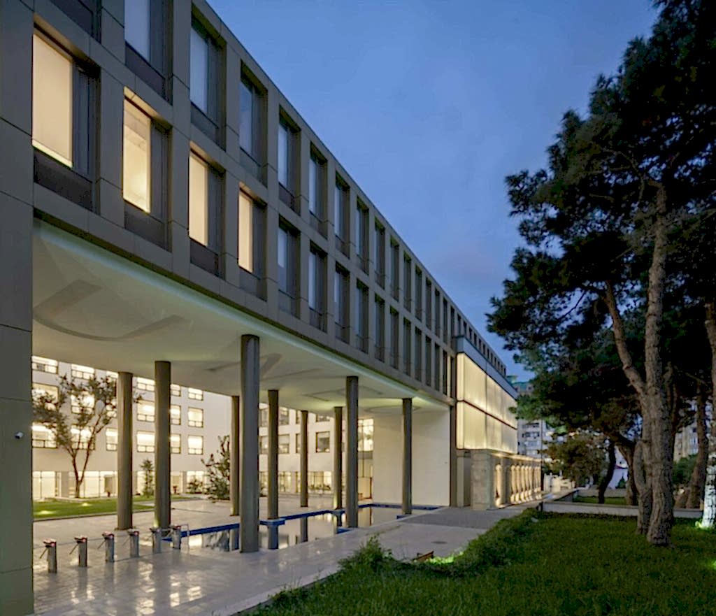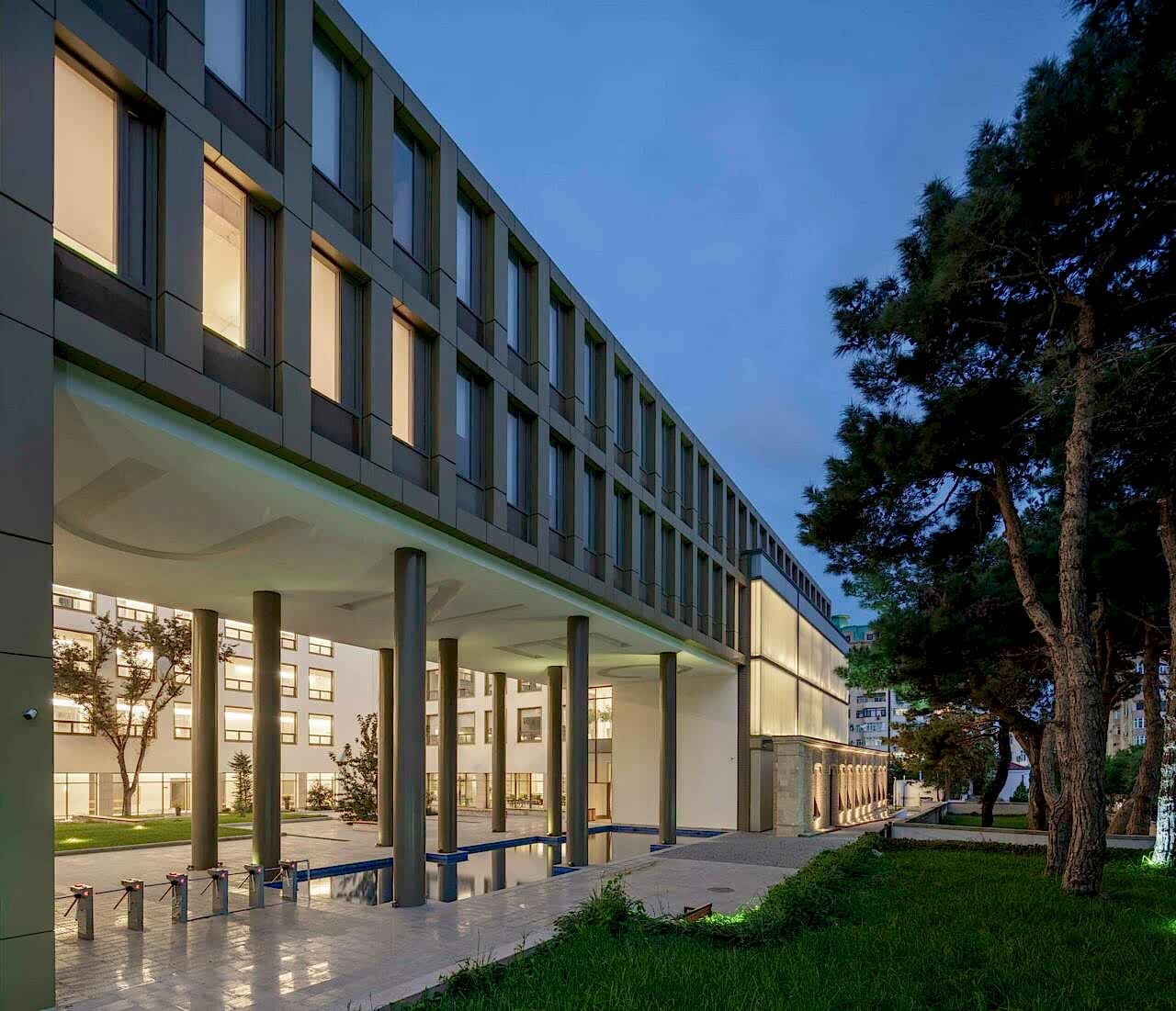 Yapının sokak tarafından algısında mevcut ince uzun ağaç dizisini koruyup ona uyum sağlamak, 30 metre kadar alt kotta bulunan cadde algısını ise topografyanın da yardımıyla heybetli ve görünür kılmak amaçlandı. Bakü’nün kuvvetli rüzgârı düşünülerek, net bir avlu etrafına toplanılması ve öğrenci girişlerinin avlunun sokak tarafına derin bir boşluk yaratılarak tek kanattan yapılması yönünde karar alındı. Böylelikle avlunun sokak ile optik ilişkisi de kuvvetlendirildi.