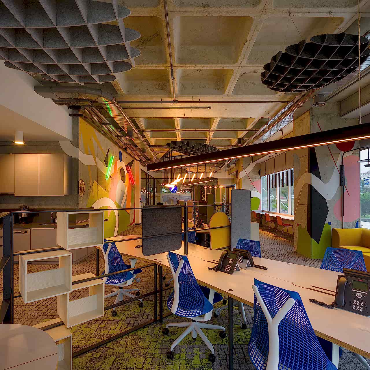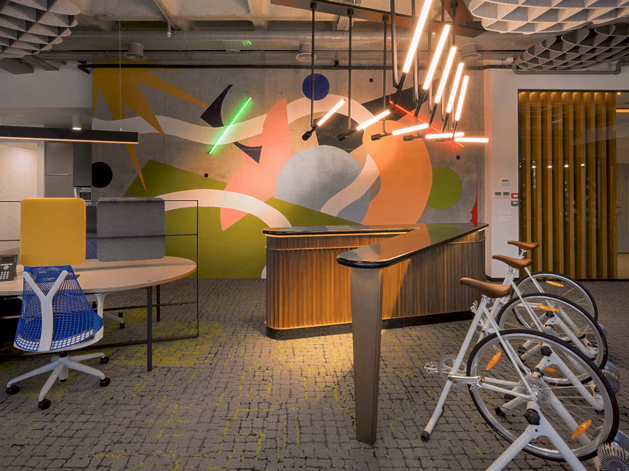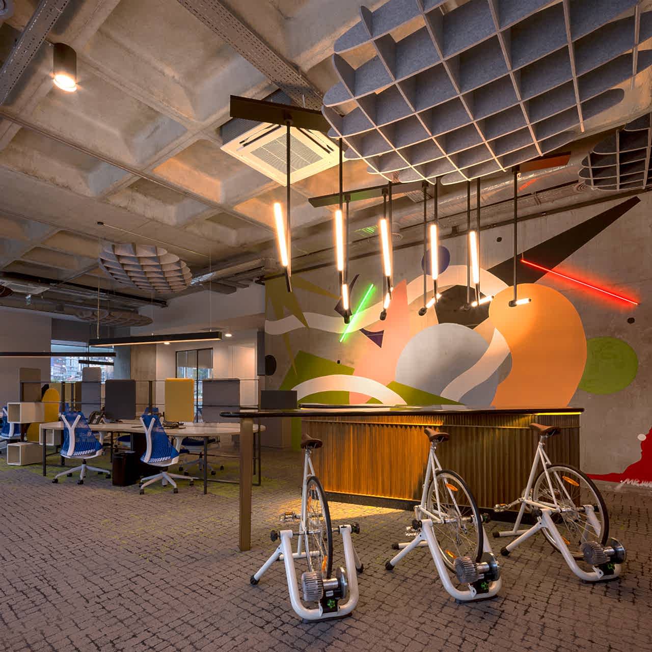 Düzenli olarak 13 kişinin çalıştığı ofiste çalışma alanlarının konforu ile beraber dinlenme ve eğlenme alanları yaratılmaya çalışılmıştır. Bar taburesi olarak bisiklet kullanılması, mekana özel graffti uygulaması, kolonlar üzerinde kullanılan lambalar ile istenen sokak konsepti vurgulanmıştır.